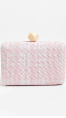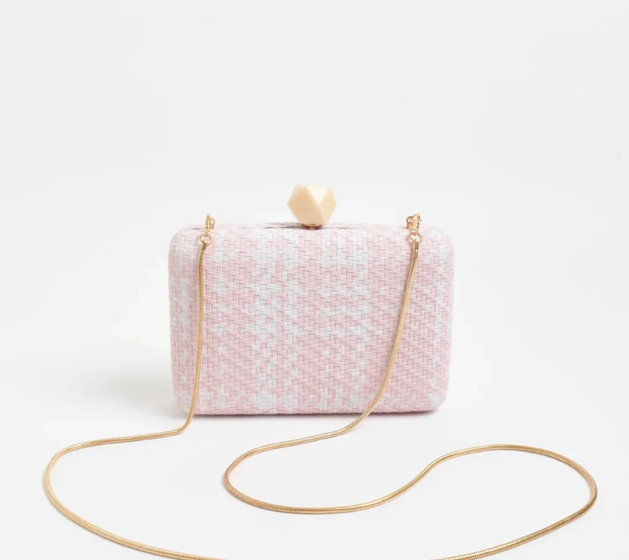 Crafted from premium vegan leather, this sophisticated clutch showcases a striking pink and white checked weave pattern. The piece is anchored by a tonal resin clasp and includes a removable gold-plated snake chain shoulder strap for versatile styling. A soft beige lining completes the interior, while plated metal hardware ensures lasting durability. An elegant accessory that seamlessly transitions from day to evening occasions.