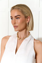 The product features a stud back closure and is made of plated metal. The earrings are long and make a statement.