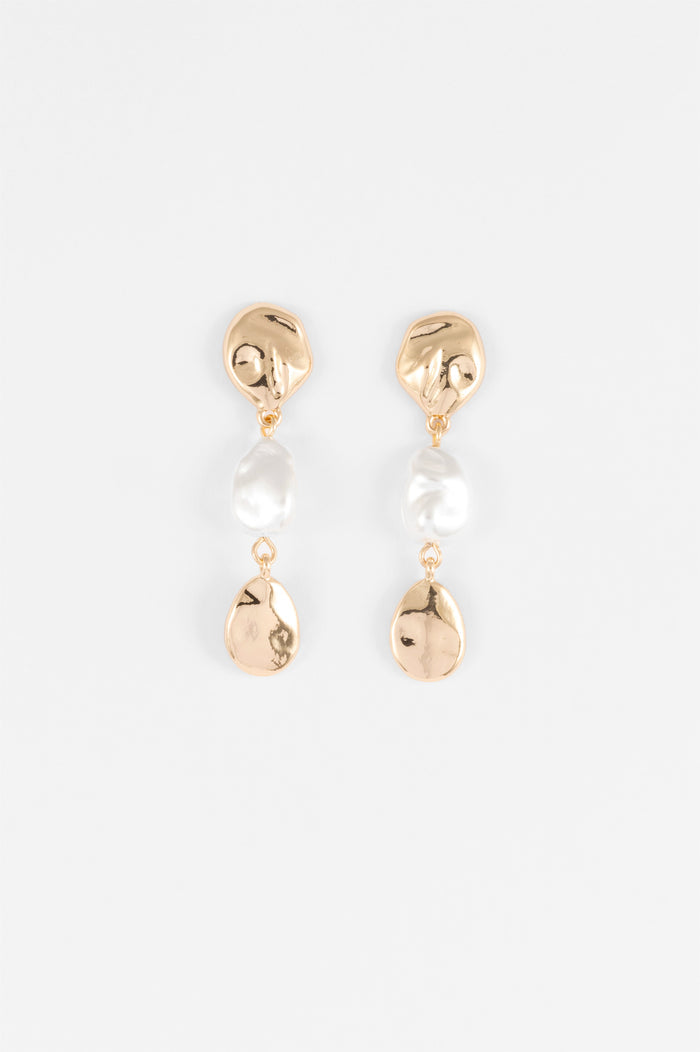 Gold molten pearl disc drop earrings featuring molten textured discs and floating pearl drops