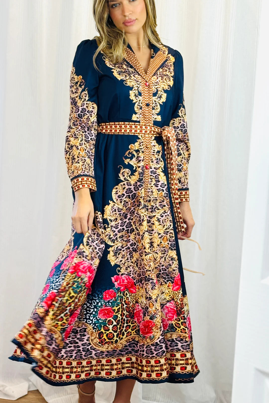 Exude confidence and style in this vibrant red maxi dress. The striking hue is complemented by an intricate, baroque-inspired print in shades of navy, gold, and pink, creating a luxurious and eye-catching look. Featuring a deep V-neckline and a cinched waist with a self-tie belt, this dress is designed to flatter your figure. The long, flowing skirt and elegant print detailing make it an ideal choice for a formal event, a wedding, or a glamorous night out. Pair with strappy heels to complete the ensemble.