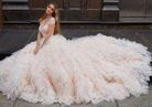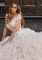 If you want drama and glamour, look no further than our Josefina designer wedding dress. The over-the-top ball gown features a delicately draped bodice with romantic sweetheart neckline and a matching detachable tie-back stole. The ruffled tulle skirt creates fabulous texture with a subtle, swirling floral motif for a gown that will leave guests gasping as you walk down the aisle. Shown in Bellini.
