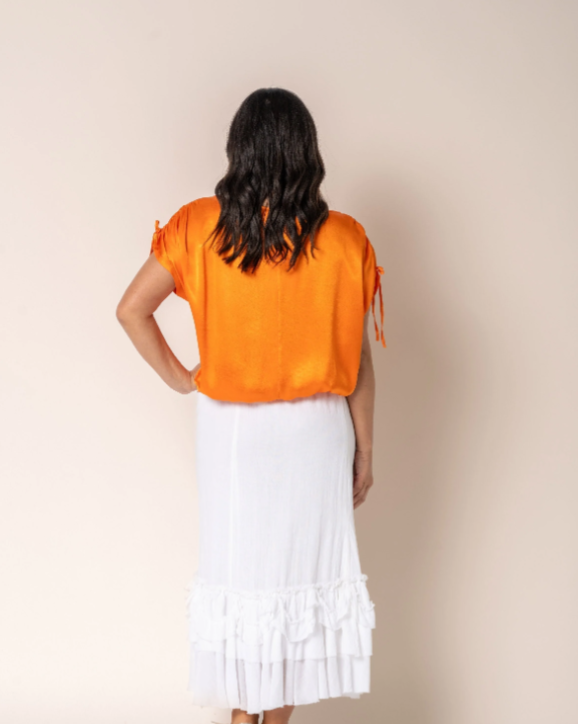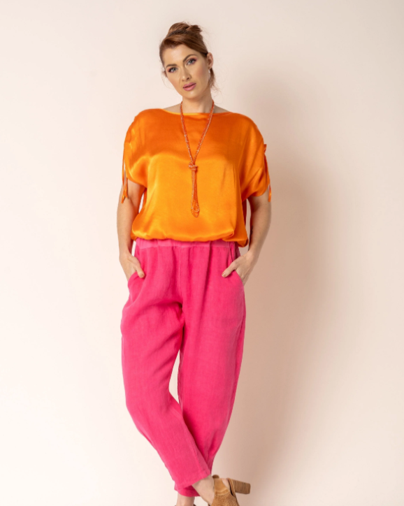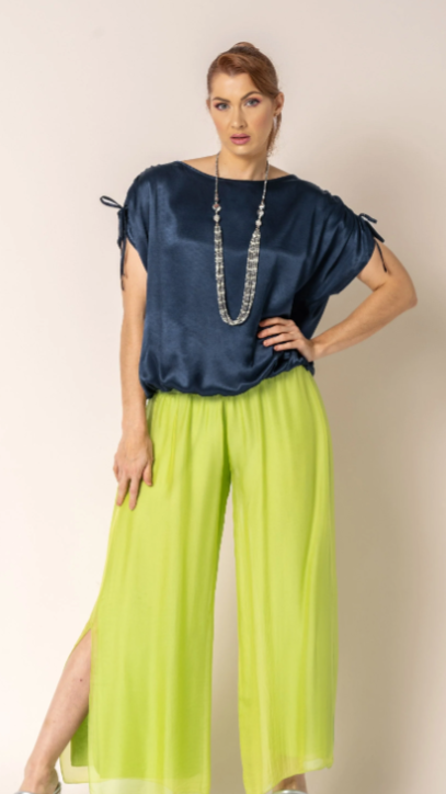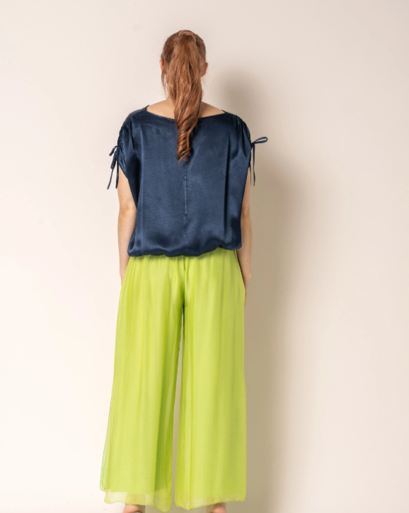 This elegant viscose top is designed to elevate your everyday style. It features ruched sleeves with charming tie details, adding a touch of sophistication to the look. The round neck offers a classic appeal, while the elastic waistband ensures a flattering and comfortable fit. This top combines comfort and elegance effortlessly, making it a versatile addition to any wardrobe.