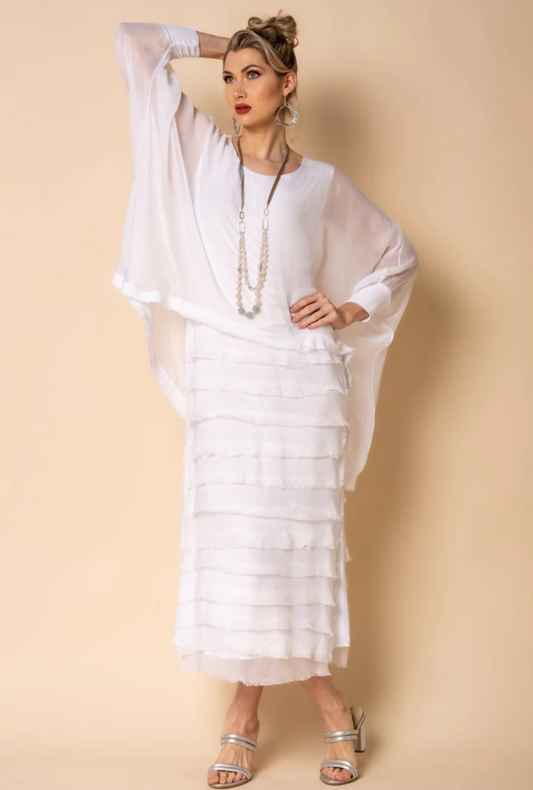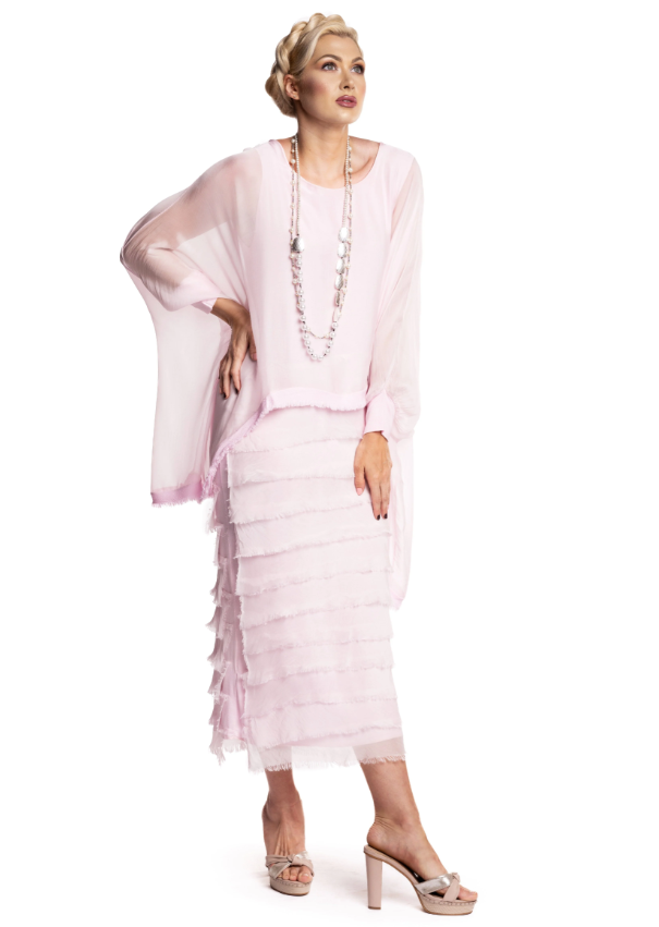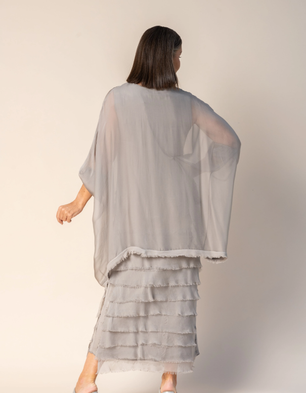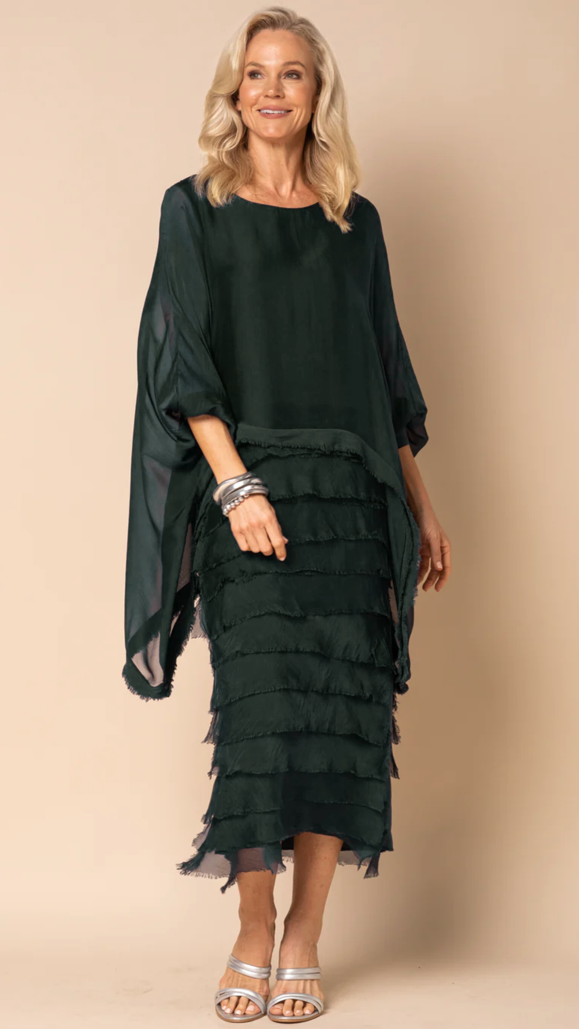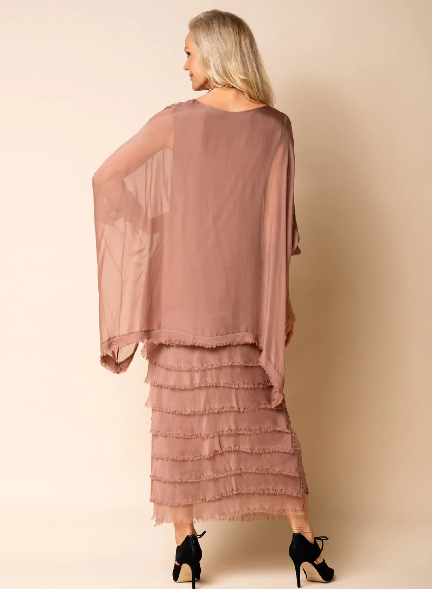 Elevate any special occasion with this exquisite silk dress. A timeless piece, it is fully lined with a bodice featuring delicate frayed edges and stretchy cuffed sleeves. To complete the look, cascading silk layers make for a stunning skirt. An absolutely phenomenal look!