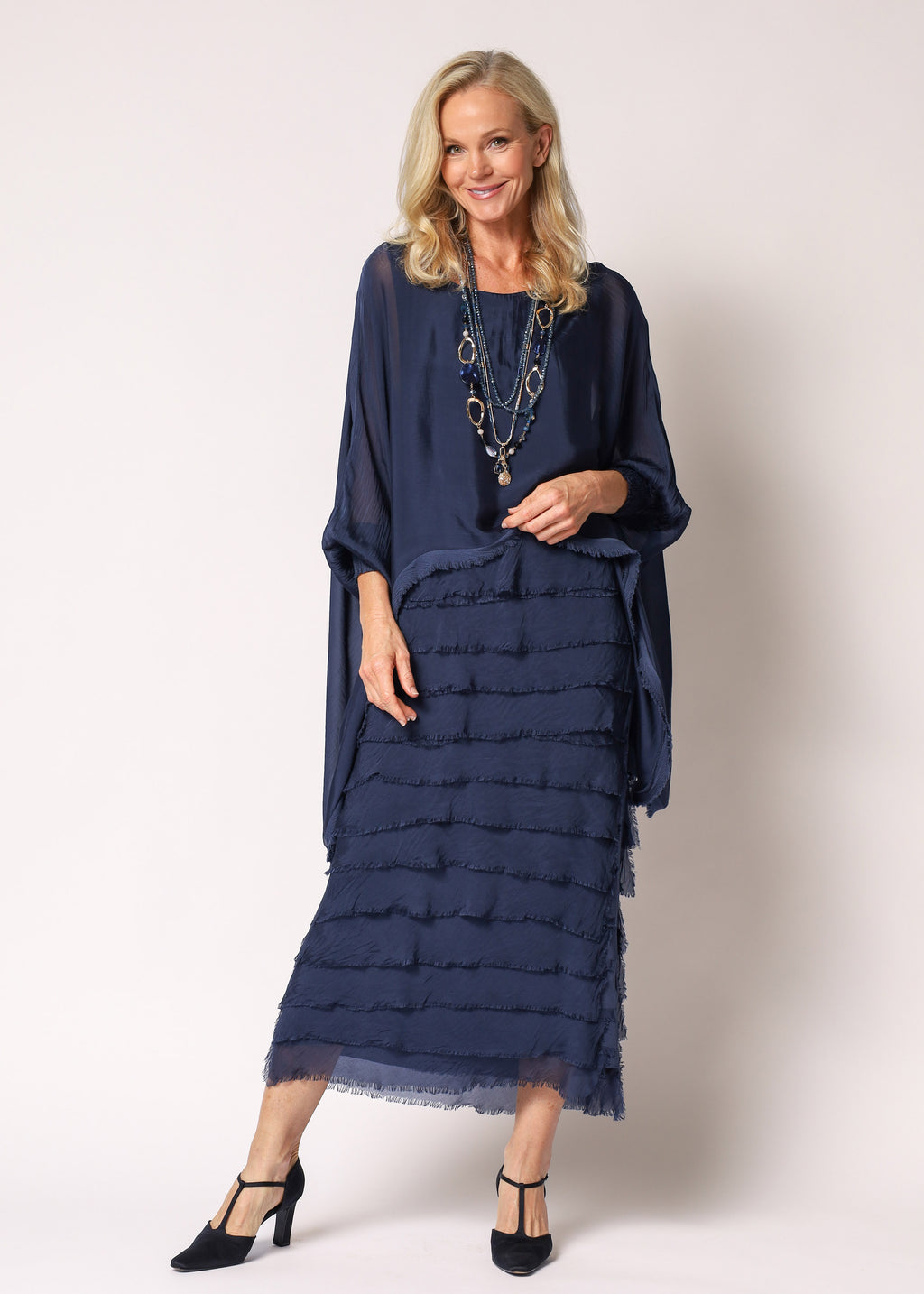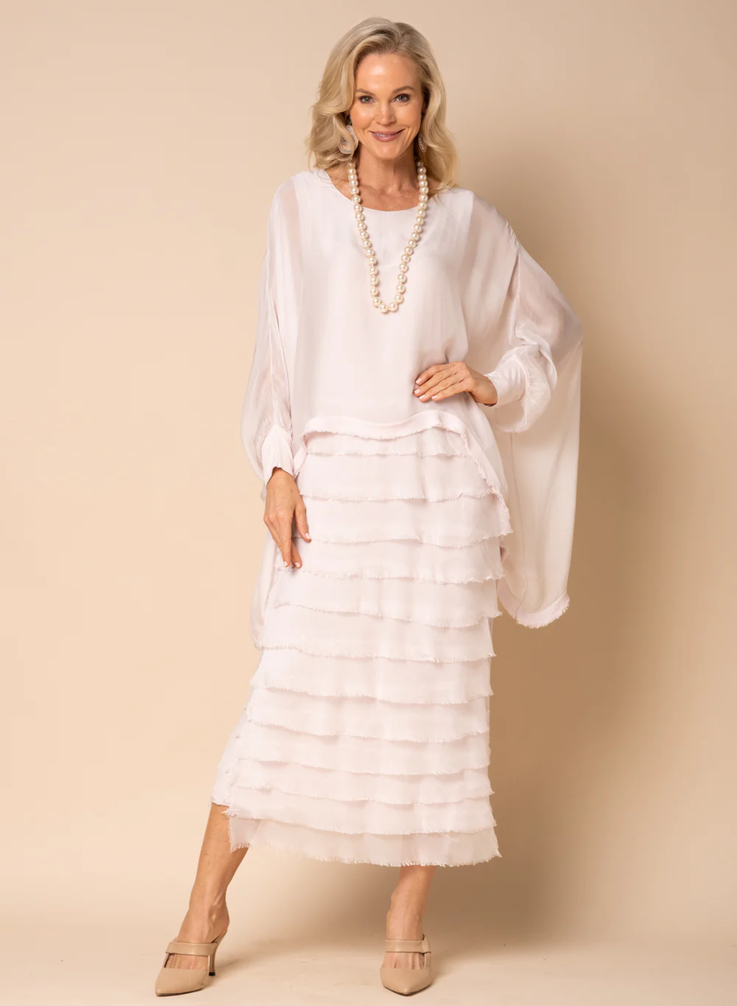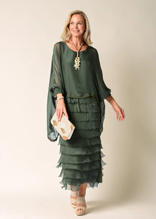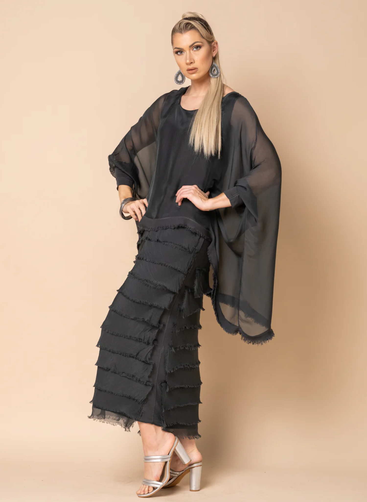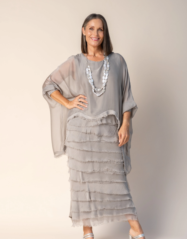 Elevate any special occasion with this exquisite silk dress. A timeless piece, it is fully lined with a bodice featuring delicate frayed edges and stretchy cuffed sleeves. To complete the look, cascading silk layers make for a stunning skirt. An absolutely phenomenal look!