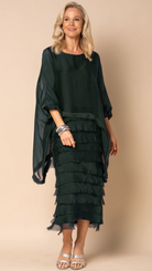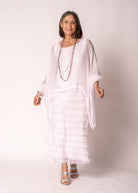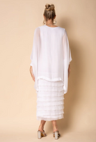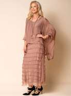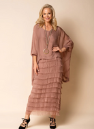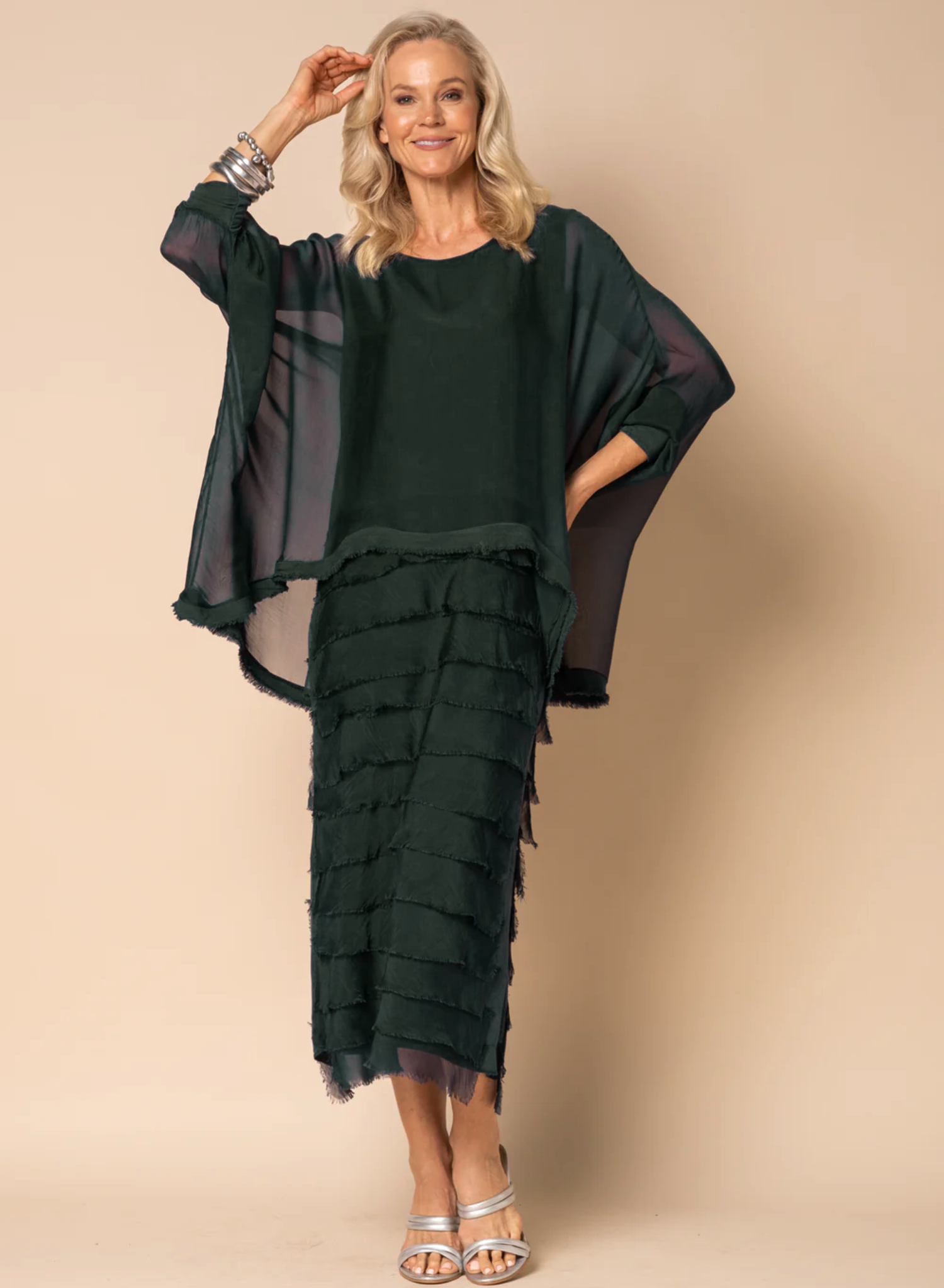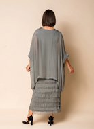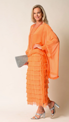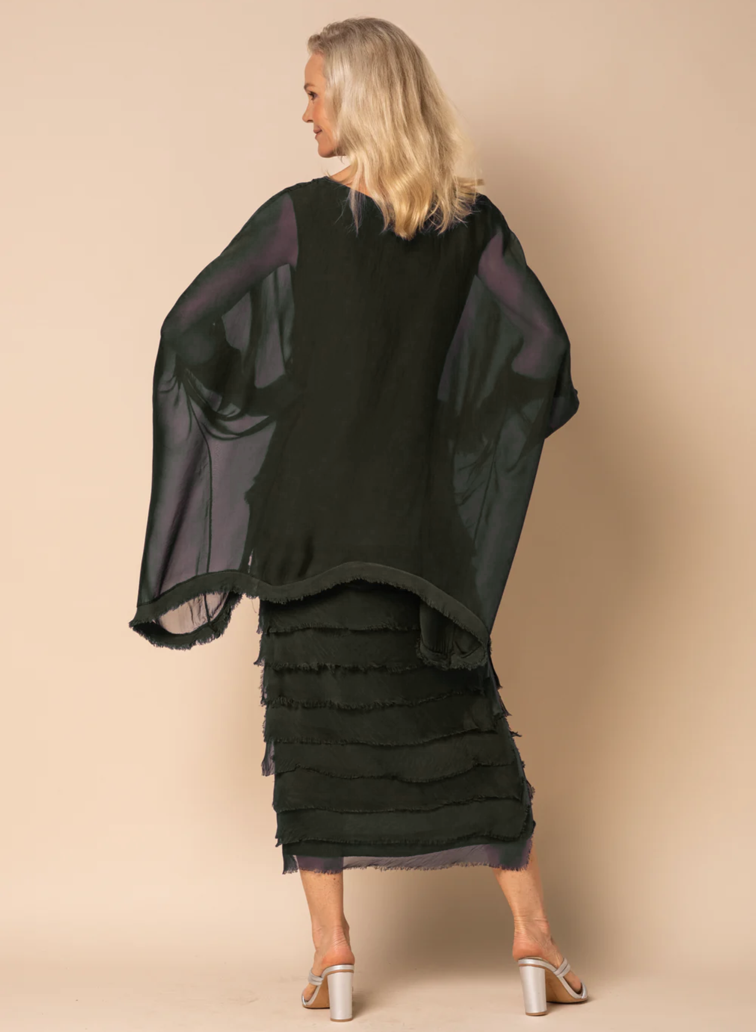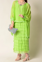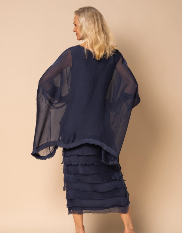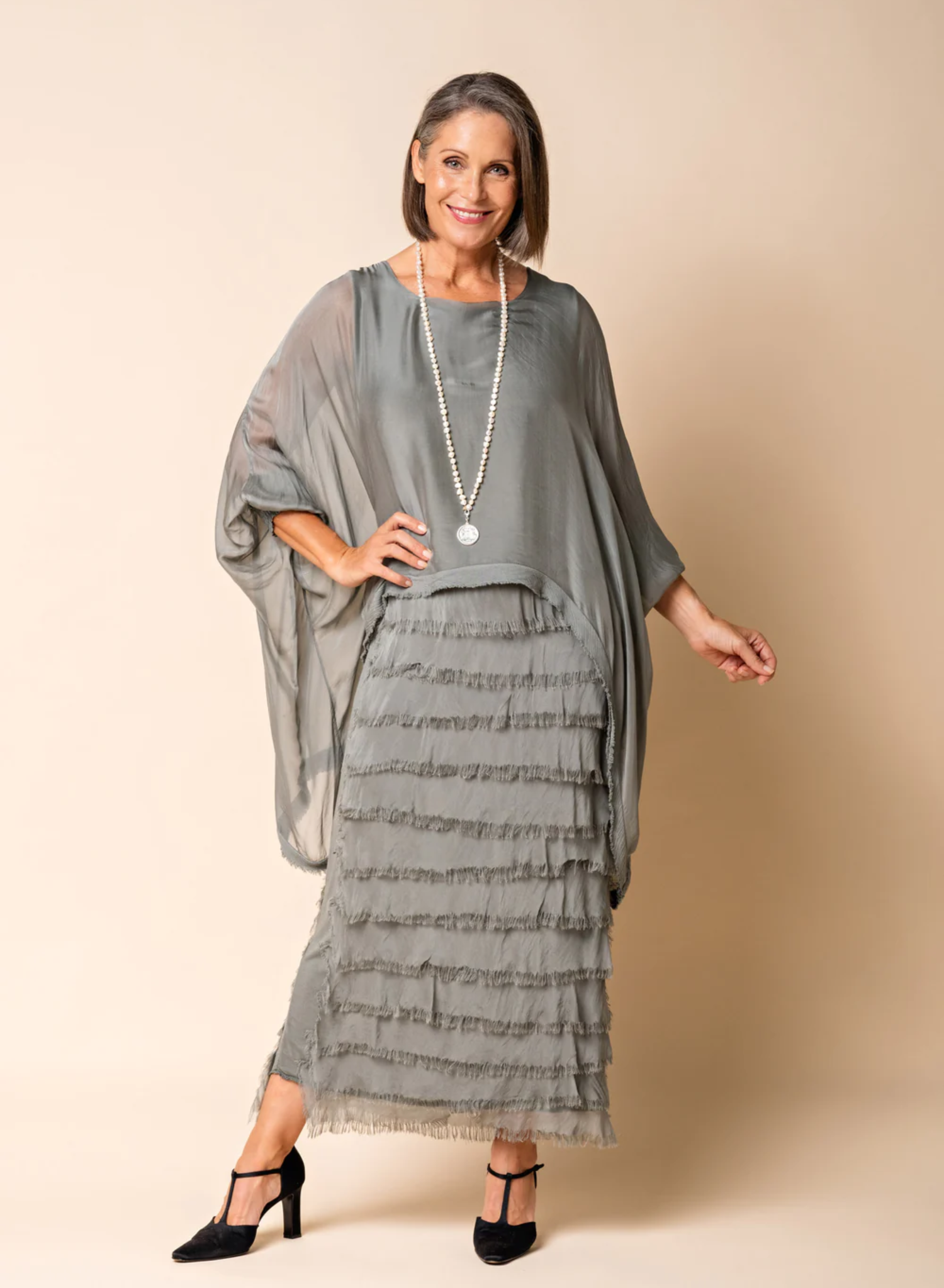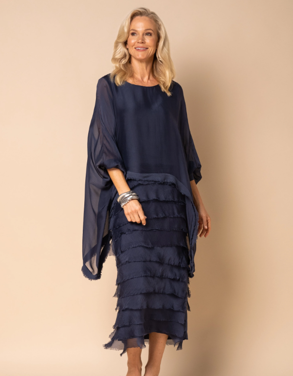 Elevate any special occasion with this exquisite silk dress. A timeless piece, it is fully lined with a bodice featuring delicate frayed edges and stretchy cuffed sleeves. To complete the look, cascading silk layers make for a stunning skirt. An absolutely phenomenal look!