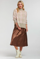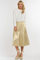 The Celine Skirt offers a perfect blend of comfort and style, featuring a flattering A-line silhouette, a flexible elastic waistband, and a metallic finish that adds a touch of glamour.