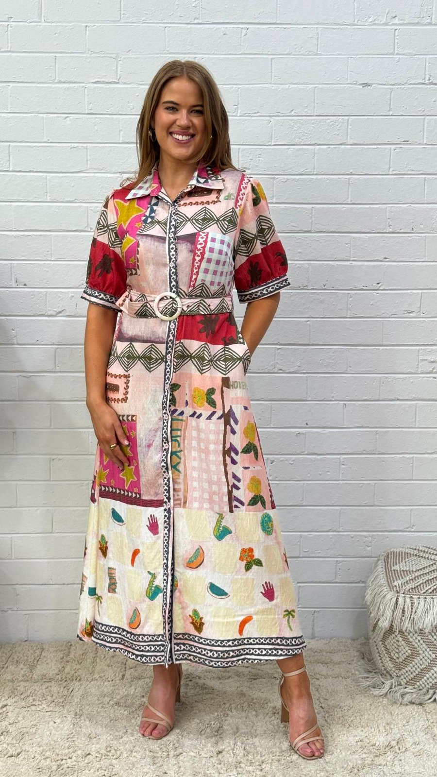 This maxi-length shirt dress combines timeless sophistication with all-day comfort, making it perfect for any occasion. The chic button-through front adds a touch of versatility, allowing you to style it your way—fully buttoned for a polished look or left slightly undone for a relaxed, carefree vibe. Paired with its vibrant, bold print and a self-belt with a buckle, the Dahlia Dress is as eye-catching as it is flattering, ensuring you’ll stand out in any crowd.