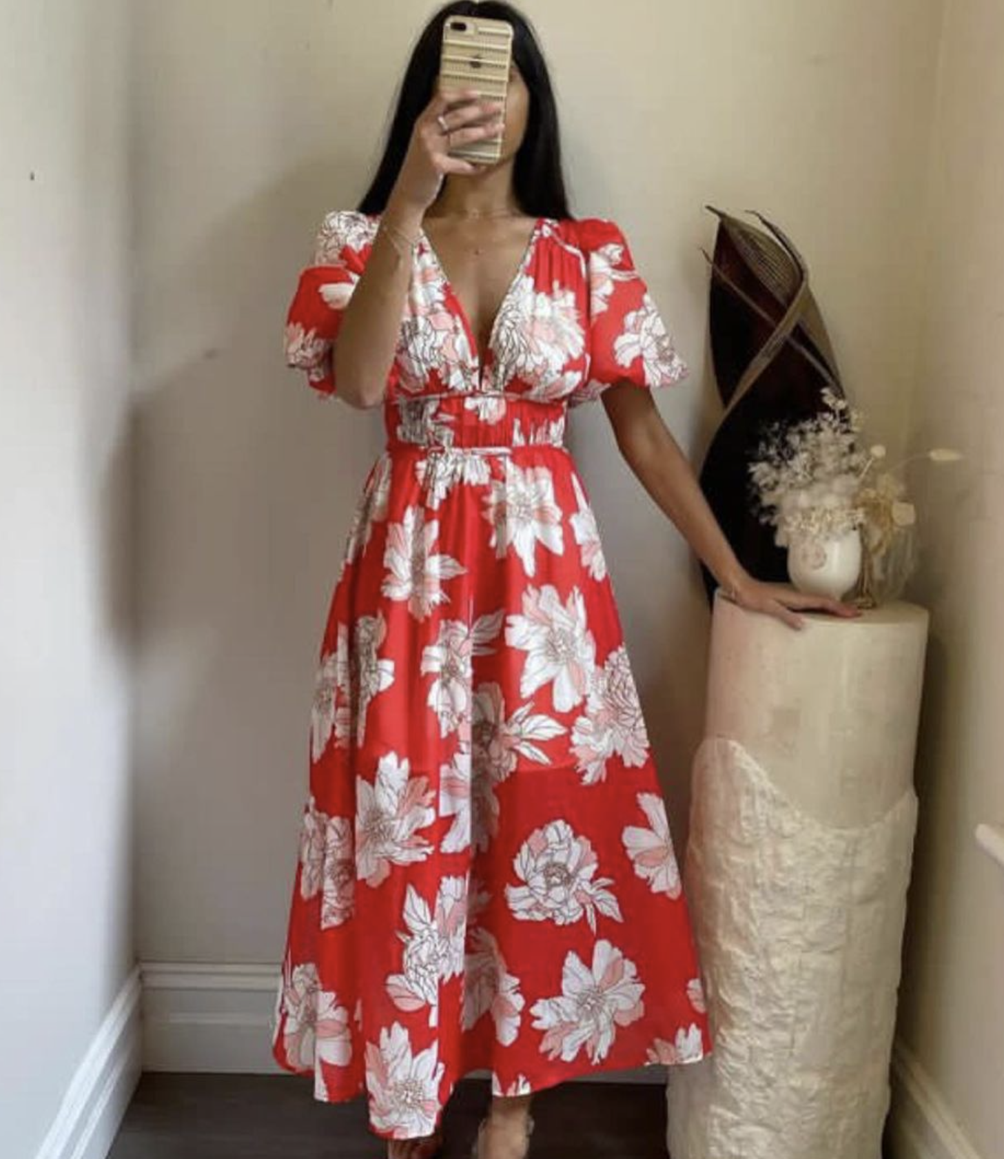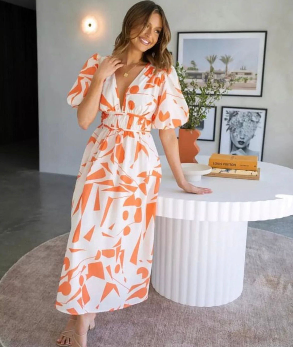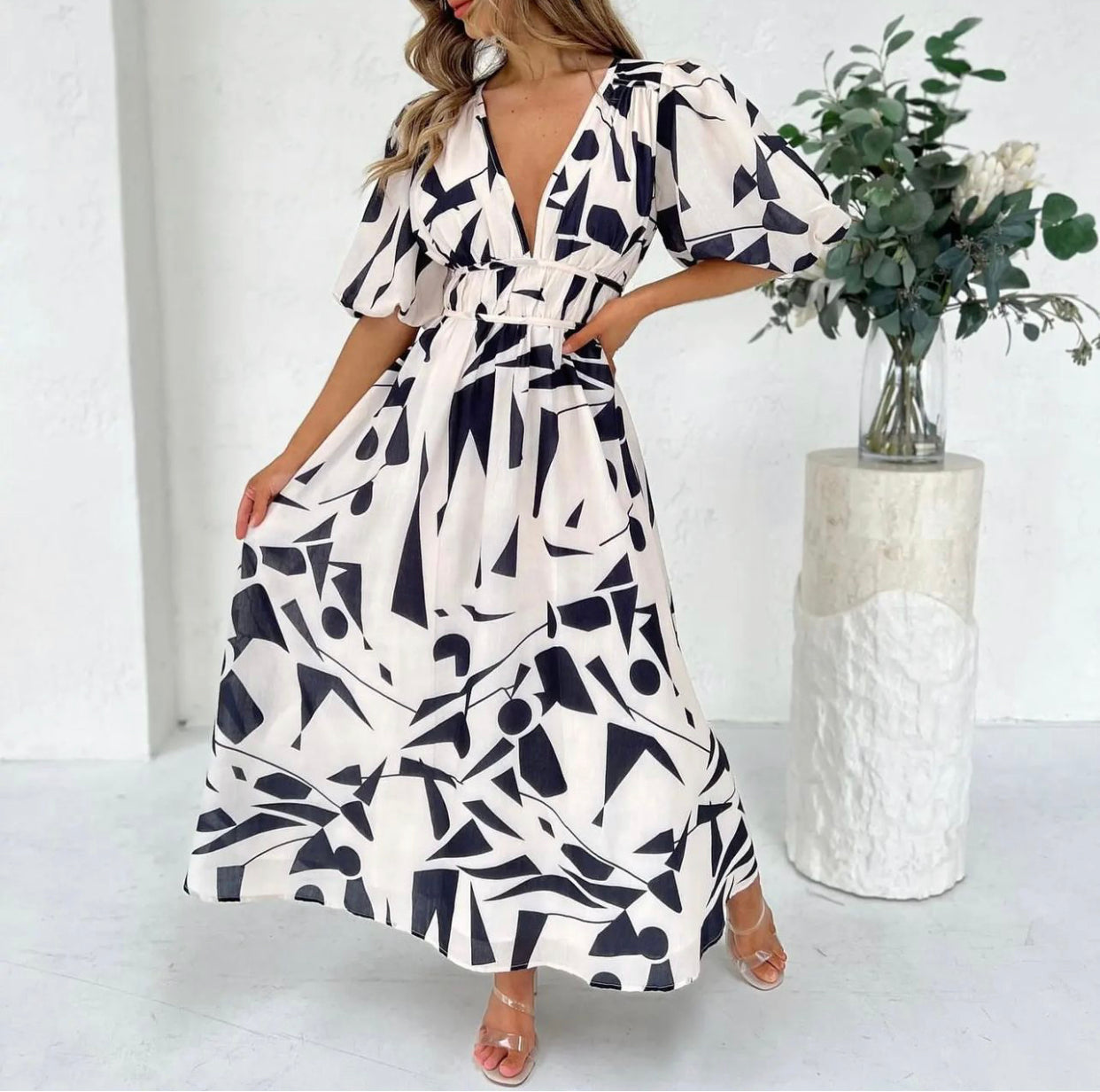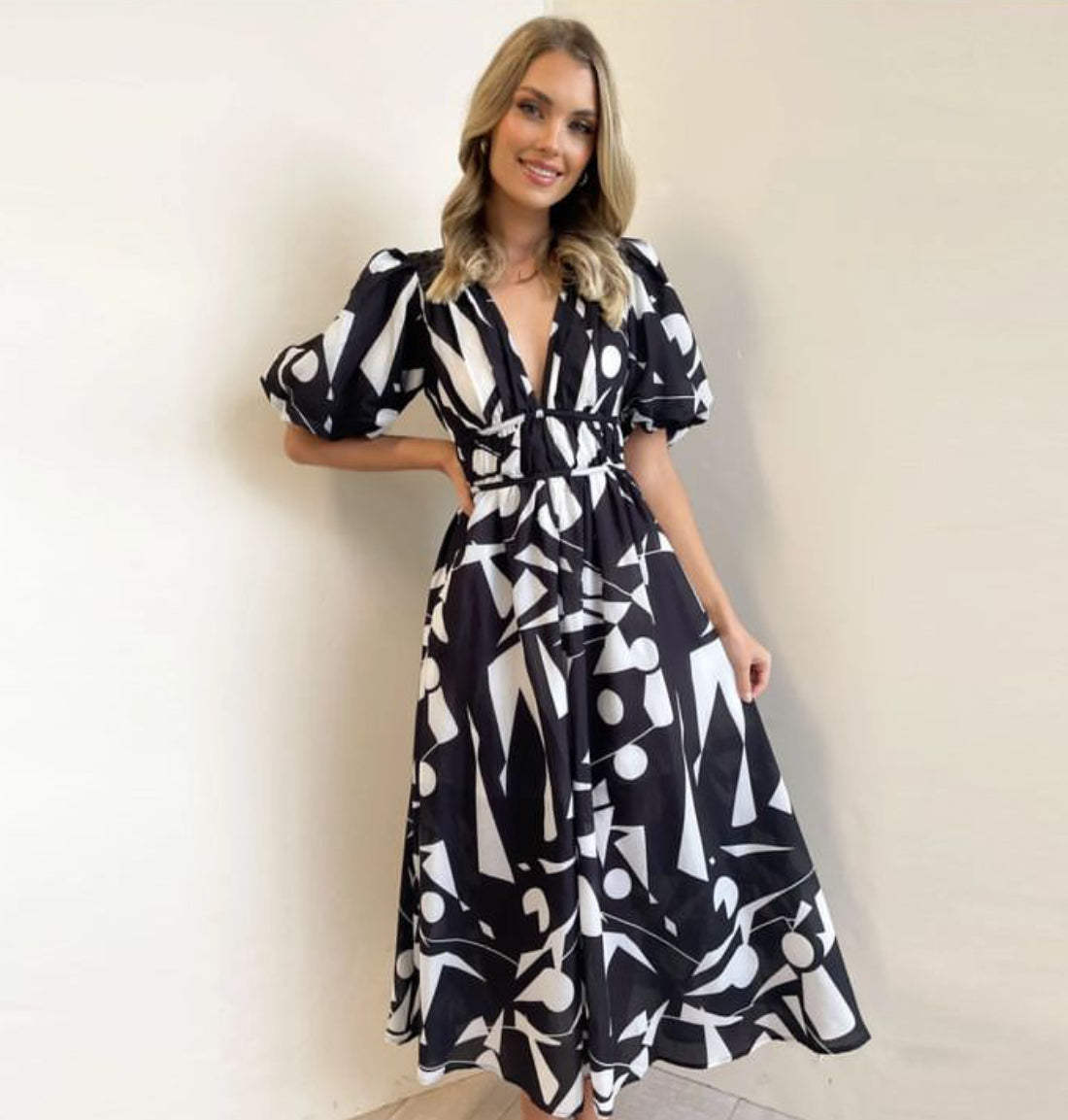 The Demi dress is a summer MUST HAVE with the perfect black and white print, waist detailing, v shaped neck line, a puff sleeve to die for all finished in a soft flowing fabric.