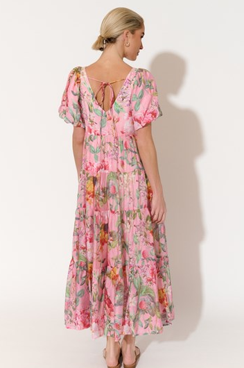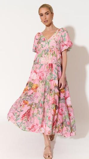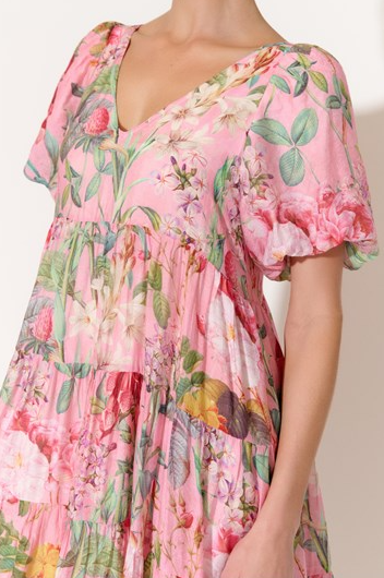 The Holland Floral Maxi Dress in pastel pink features a delicate botanical print and a flattering midi length. With its gathered shift style, this dress effortlessly combines comfort and elegance, perfect for breezy daytime outings or romantic evenings.