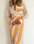 this yellow and white strip dress with side cut out detailing is stunning for any event.