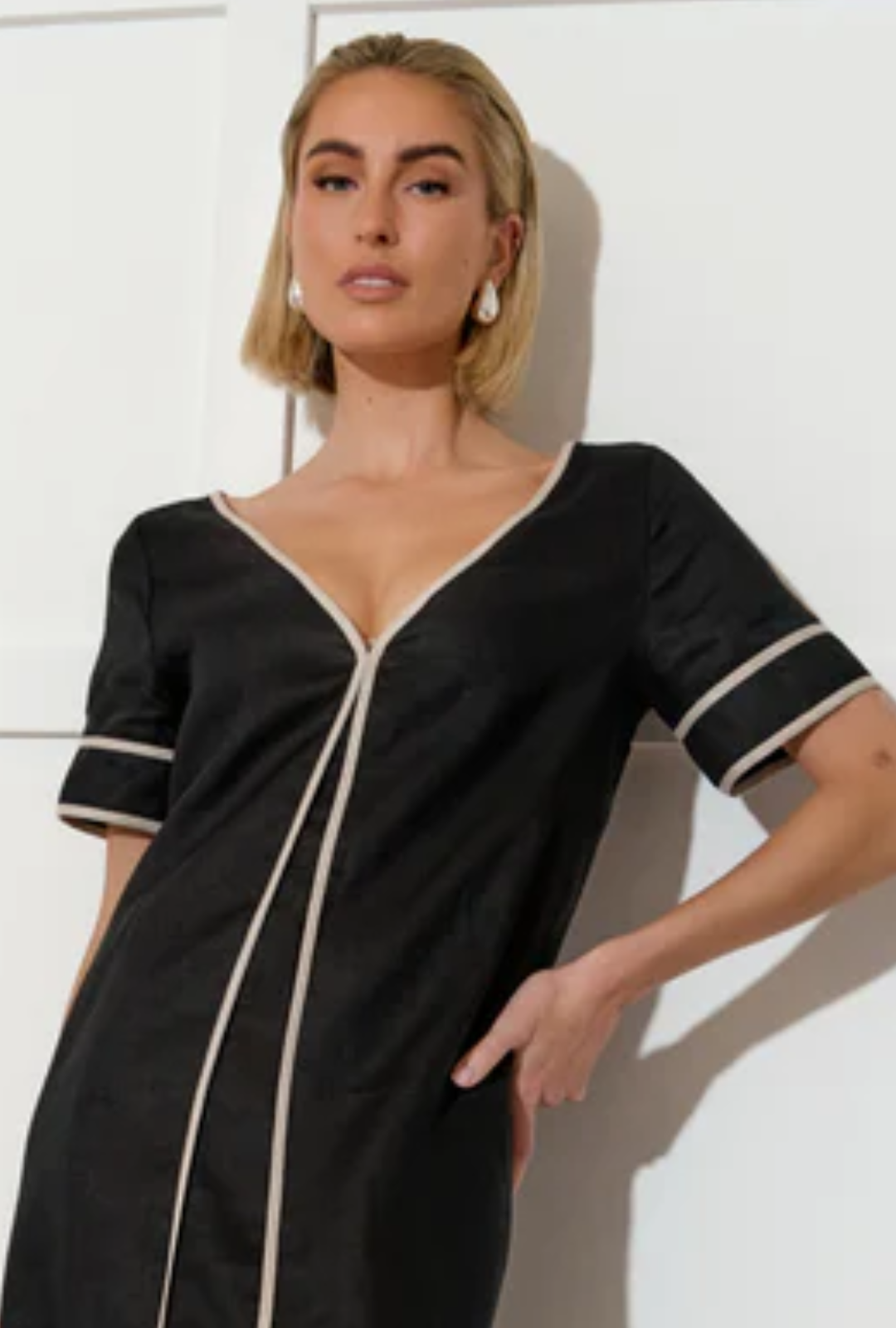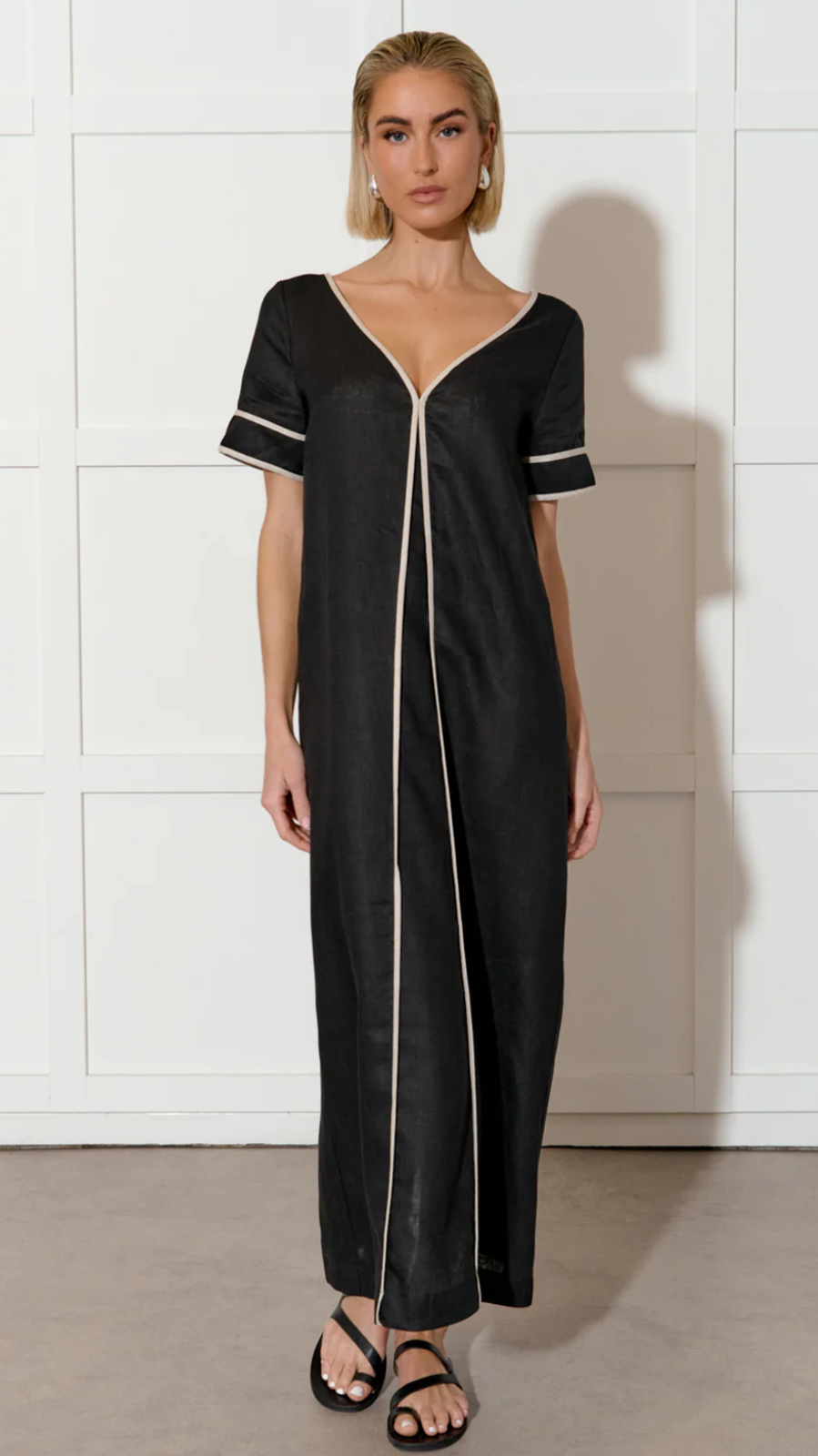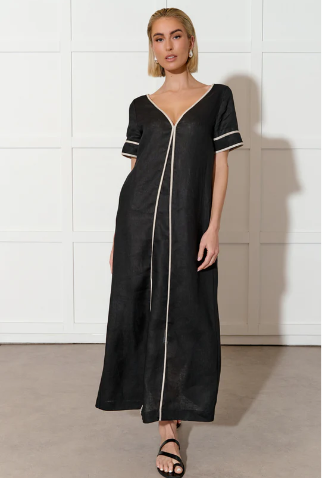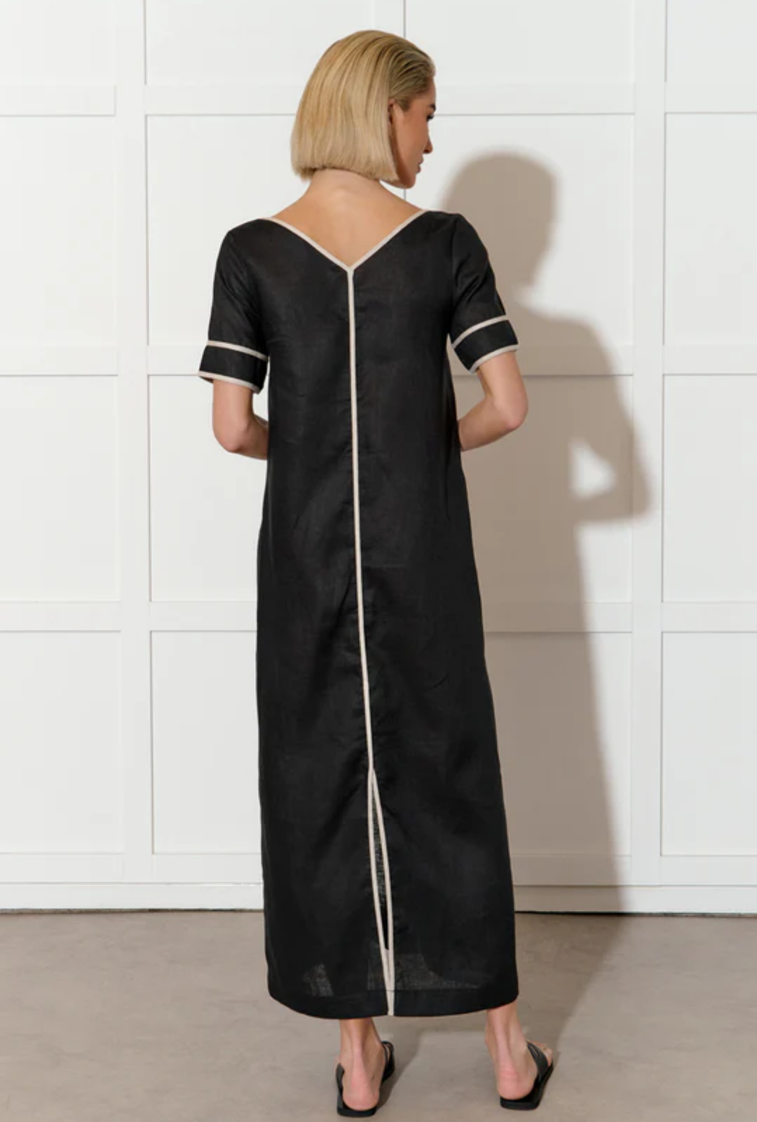 Step into timeless yet modern style with the Juniper Maxi Dress. Featuring a classic, simplified design, this dress showcases short sleeves, white contrast trims, and a graceful silhouette that effortlessly drapes. Crafted from natural linen, it combines comfort with refined ease, offering the perfect blend of sophistication and relaxed elegance.