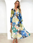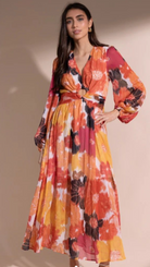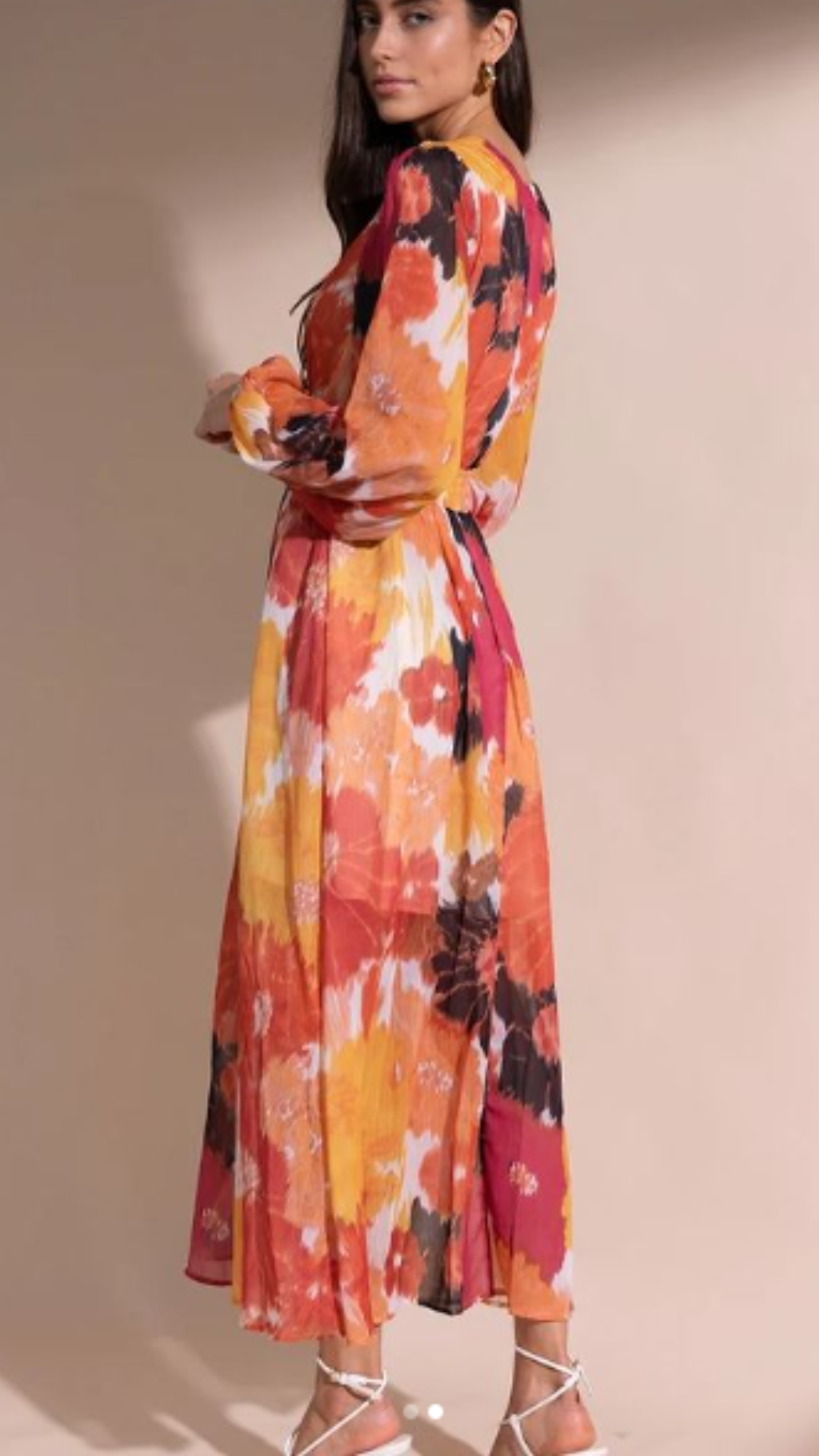 This gorgeous dress has a white background, and a floral print with reds, yellows, oranges and a hint of dark brown. The Katherine Dress is the perfect option for any upcoming dinners or events, including formals, graduation, wedding guest and spring racing.