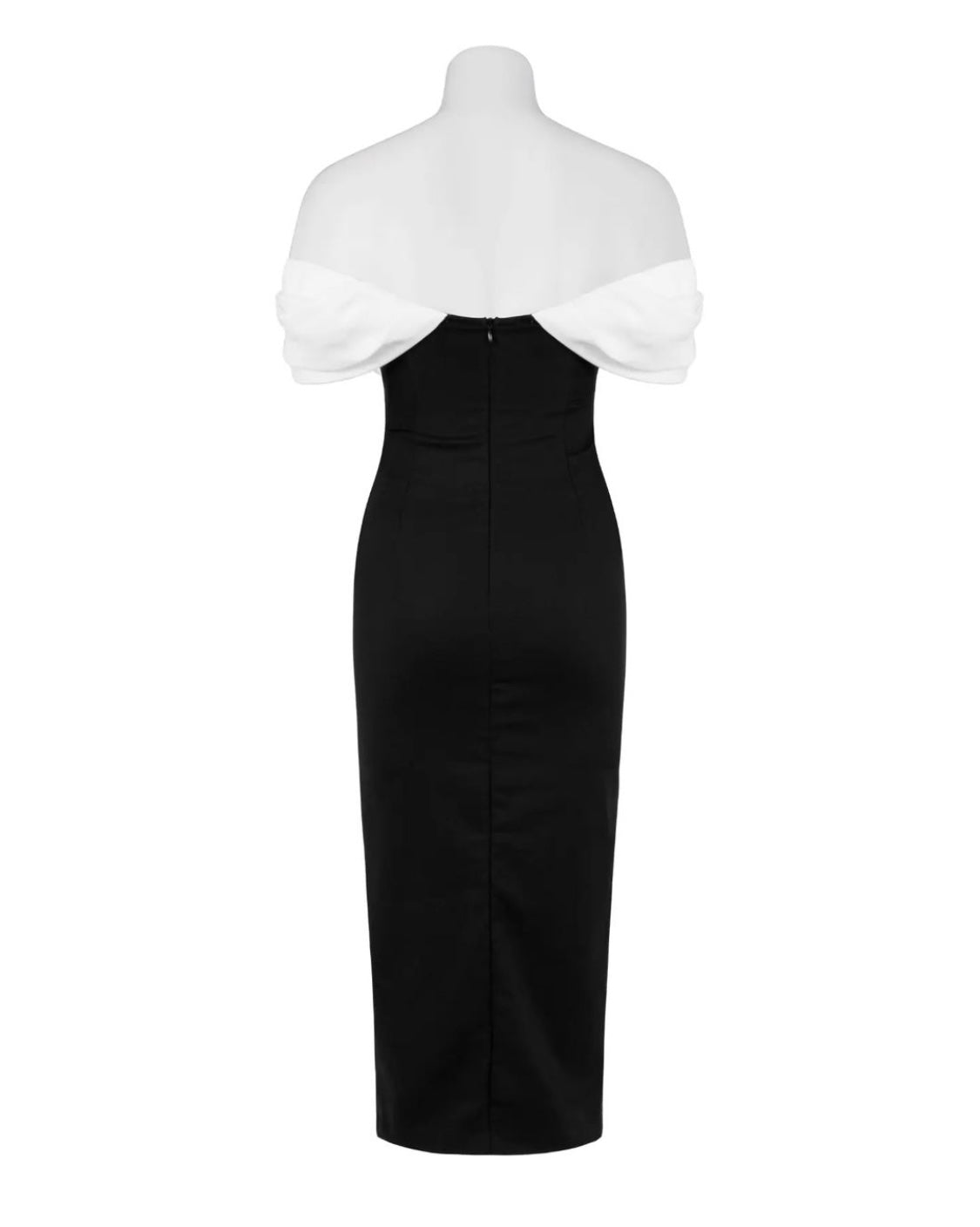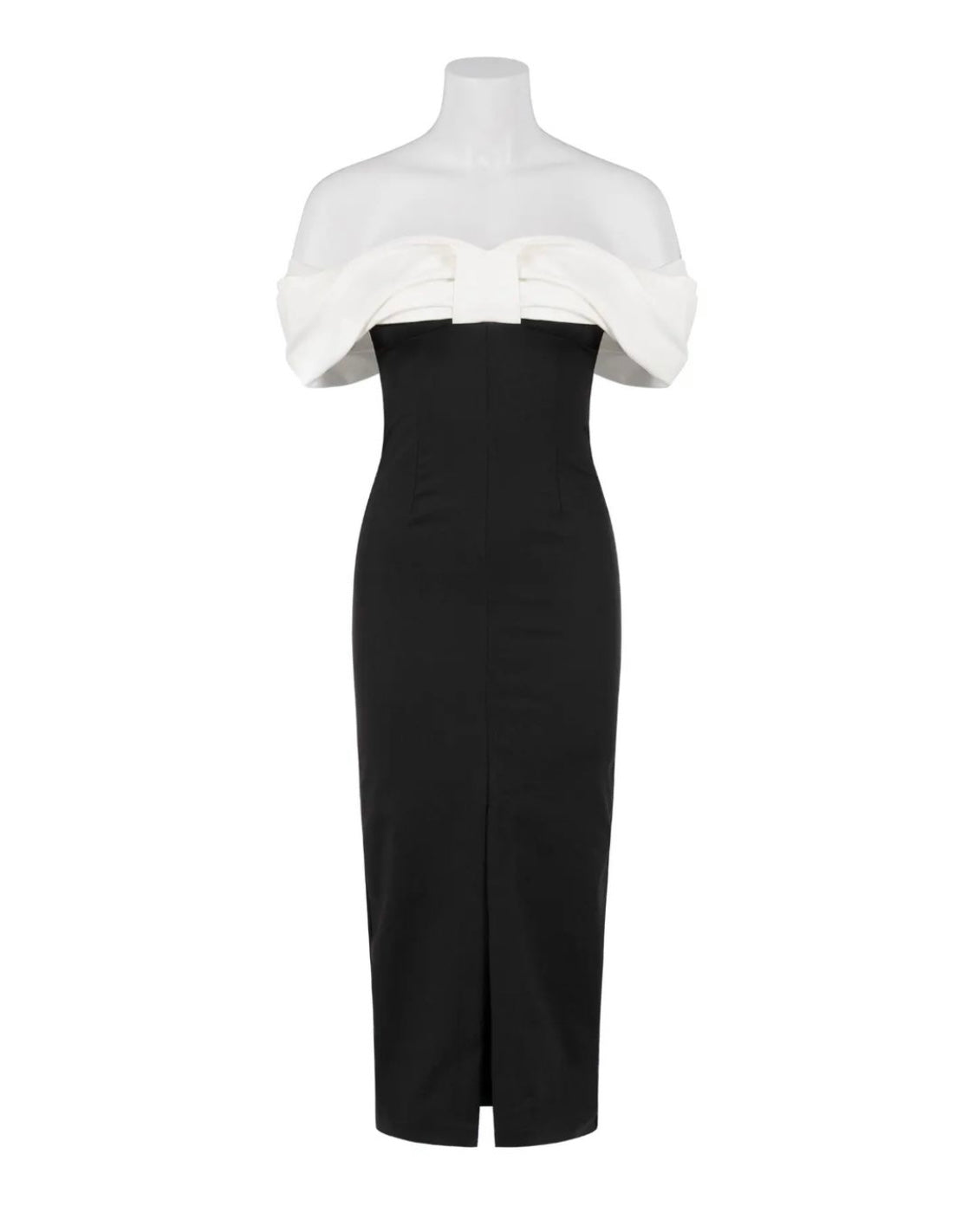 An elegant monochrome midi dress, the Kinsley Dress will be the perfect option for any cocktail or formal events you have coming up! Perfect to style with accessories, you'll love the off the shoulder detail!