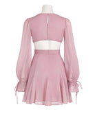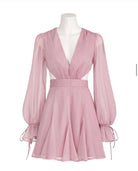V-shaped neck line into gathering at the waist, Waist cut outs, waist band, Soft fluttery skirt and a balloon sleeve with a tie cuff detailing that is to die for.