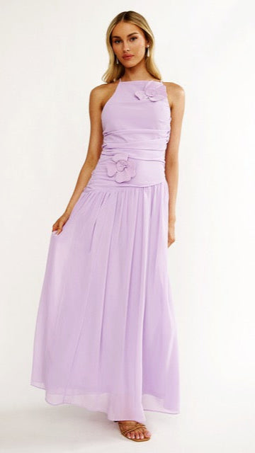 Step into timeless elegance with the Lilac Bloom Gown, designed in a soft pastel hue that feels both romantic and refined. Featuring a high neckline and a ruched bodice adorned with delicate floral appliqué, this gown flows into a full-length skirt that moves effortlessly with every step. Perfect for weddings, formal soirées, or special occasions, it pairs beautifully with minimal jewellery and strappy heels for a graceful finish.