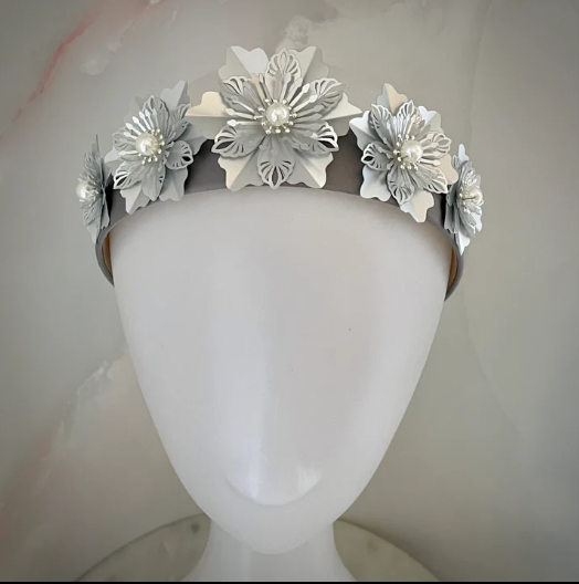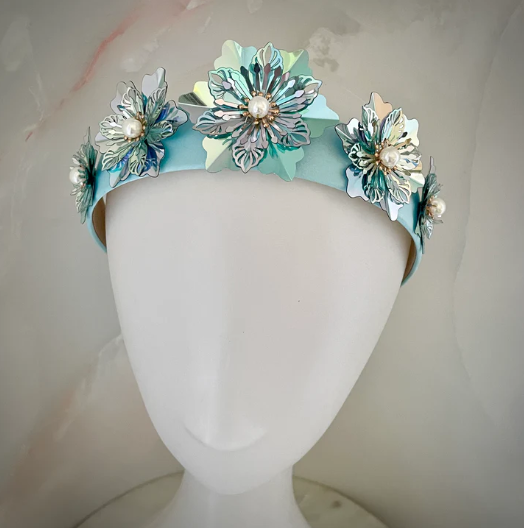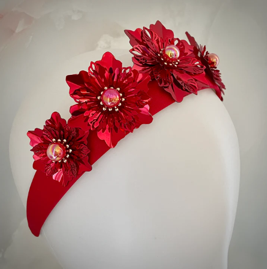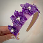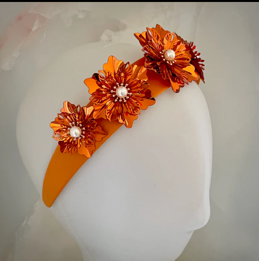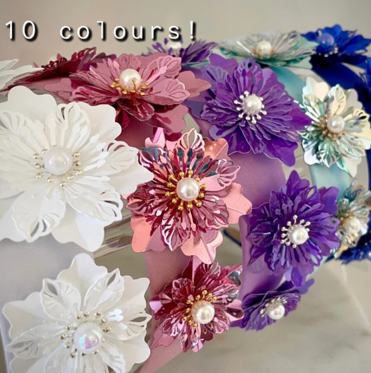 The Tinker bell headband features five signature design hand made metallic flowers. They sit across a flat 3cm satin headband.