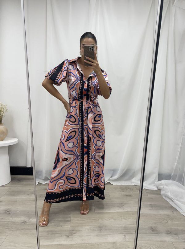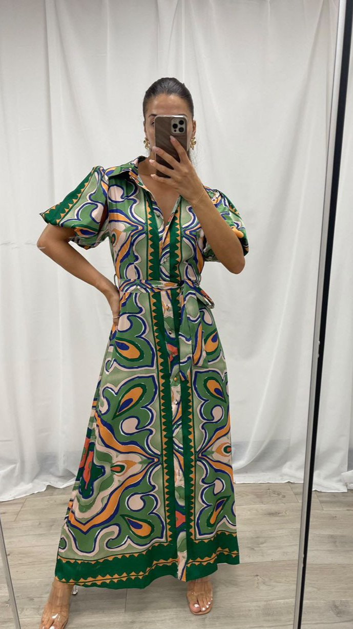 The stunning Macy Dress with short sleeves is the perfect going out dress or an easy one to throw on with some sneakers. The dress features buttons down the middle as well as a tie waist. The dress comes in green and blush and has amazing detailing.