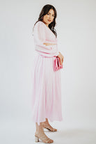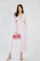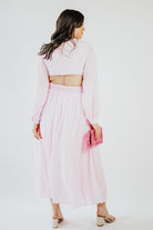 Madeline has long sleeves, and cut outs with a gorgeous split back feature. The soft pink and white colourway makes it easy to style, keep everything tonal with pink or go bold and pair it with a bright blue or purple bag to finish the look.