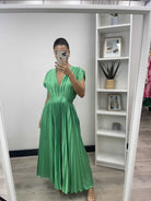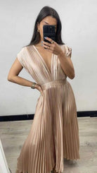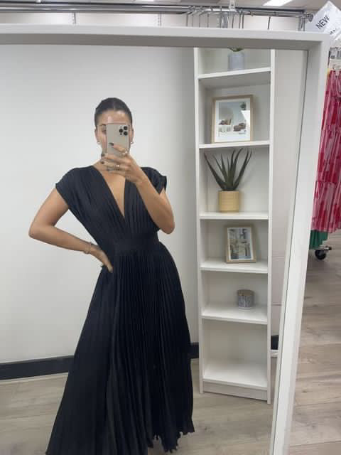 An absolutely stunning pleated dress, perfect for any formal occasion you have coming up. A soft and floaty satin fabric, this dress will be perfect with some strappy heels for a night out.