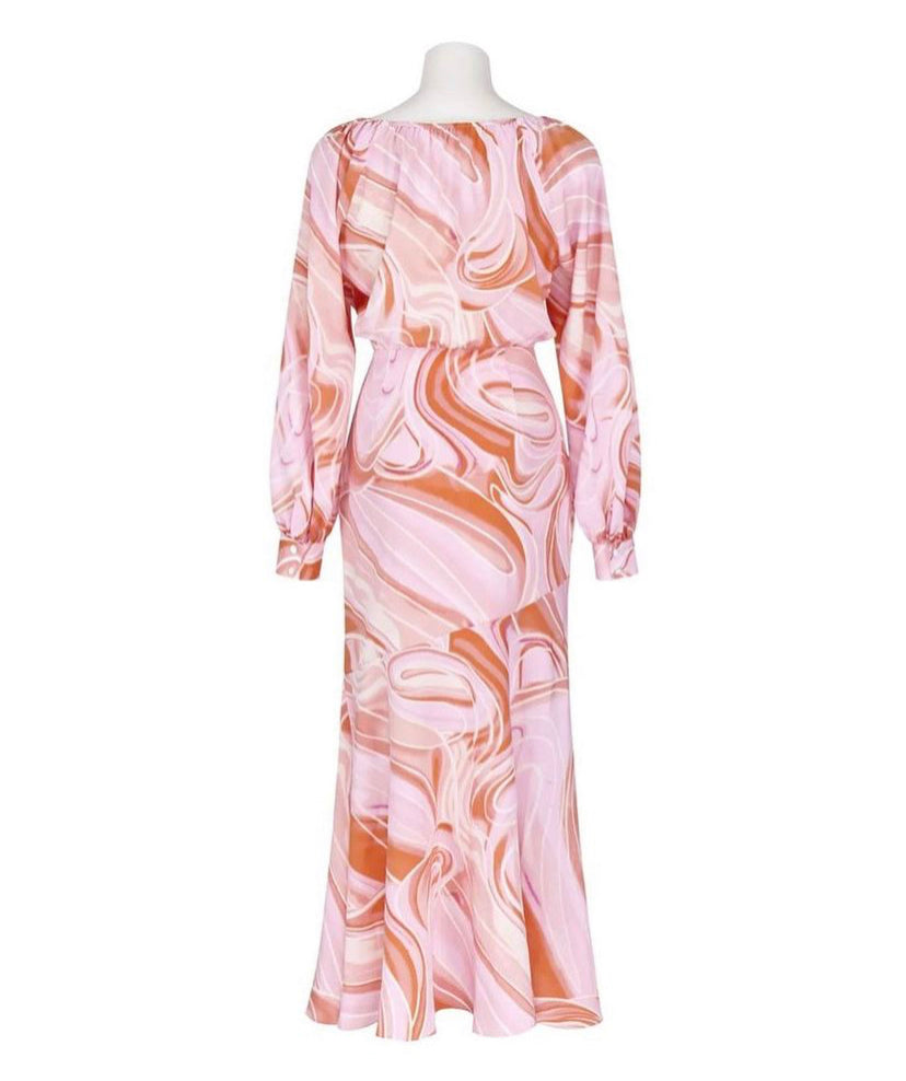 Stunning pink and tan maxi with puff sleeves. The elastic neckline allows it to be worn multiple ways including off the shoulder, one shoulder or boatneck.