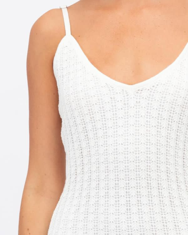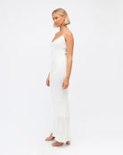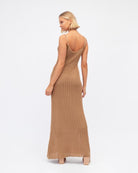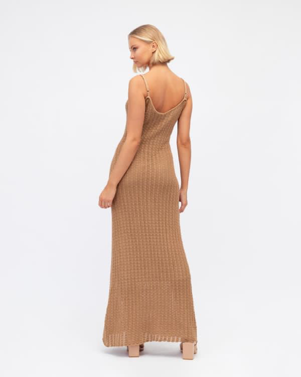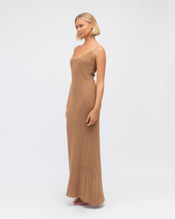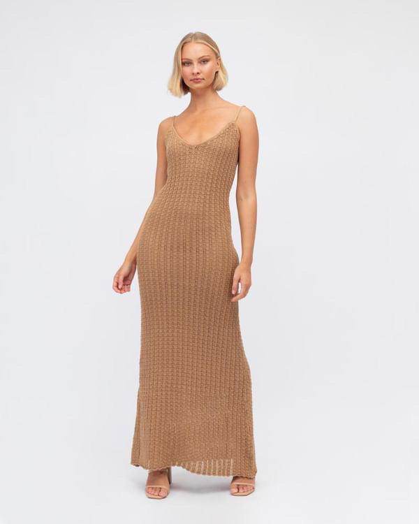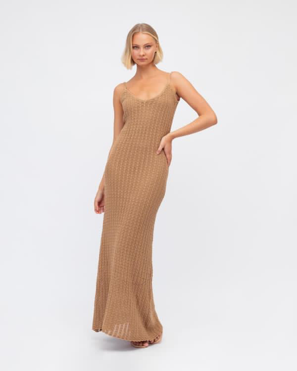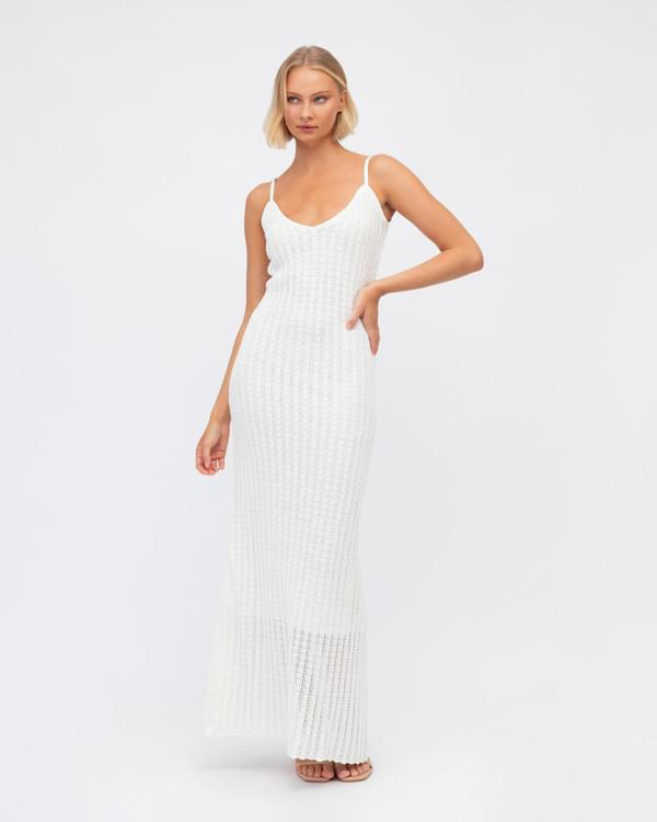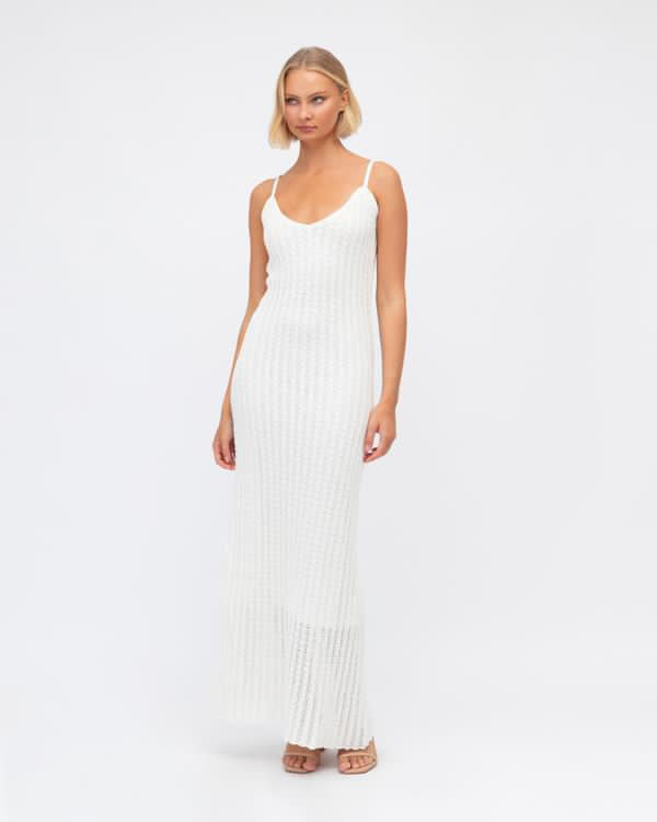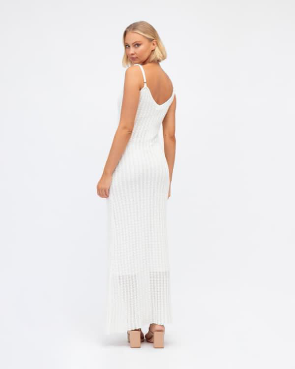 The maxi dress comes in a stunning patterned knit in both latte and white.