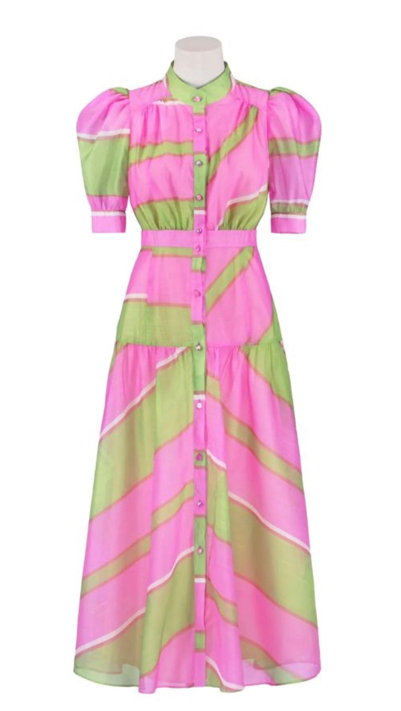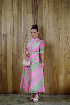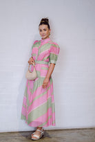 Upgrade your style with the colourful Pina Midi Dress. With centre front buttons and full sleeves, this tea-length dress is beautiful for any day or evening occasion.