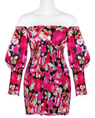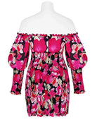 Stunning off the shoulder mini dress with ruching that begins below the chest area, along with puff sleeves that ends with the same ruching.