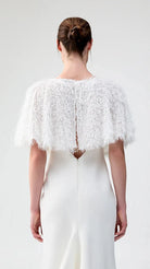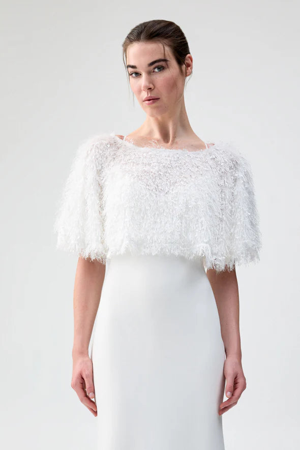 The pluma cape is an elegant finishing touch to any bridal gown or wedding look, adorned with a bespoke feather look fabrication.