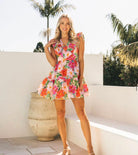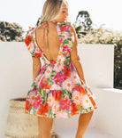 This stunning pink dress is perfect for any occasion with its slight v-neck and absolutely amazing shaped back with a tie detail. The frill detail brings something different to an otherwise a simple silhouette.
