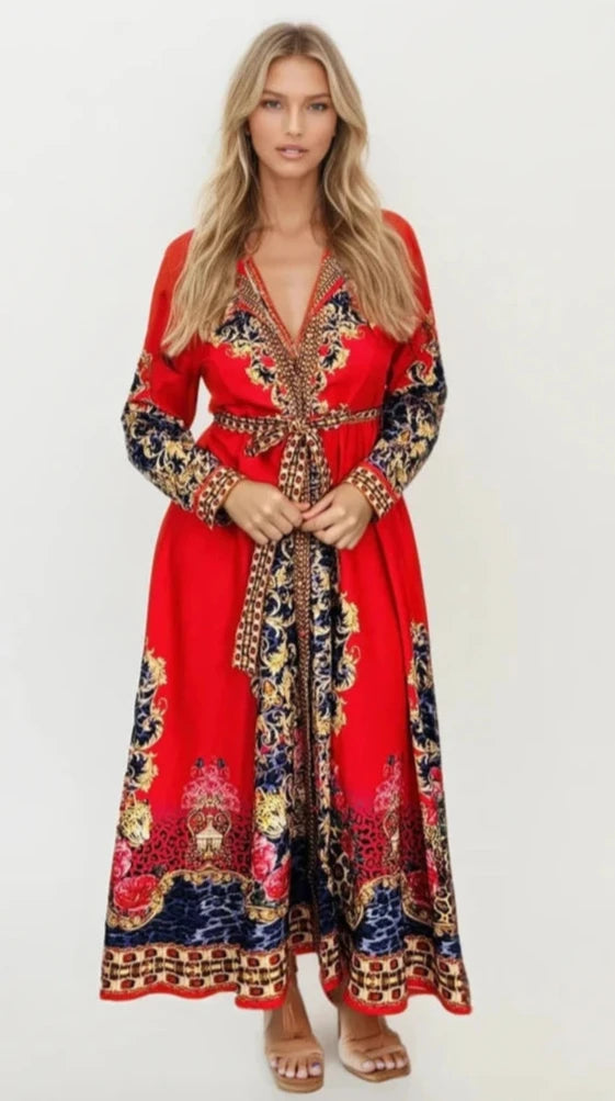 Exude confidence and style in this vibrant red maxi dress. The striking hue is complemented by an intricate, baroque-inspired print in shades of navy, gold, and pink, creating a luxurious and eye-catching look. Featuring a deep V-neckline and a cinched waist with a self-tie belt, this dress is designed to flatter your figure. The long, flowing skirt and elegant print detailing make it an ideal choice for a formal event, a wedding, or a glamorous night out. Pair with strappy heels to complete the ensemble.