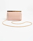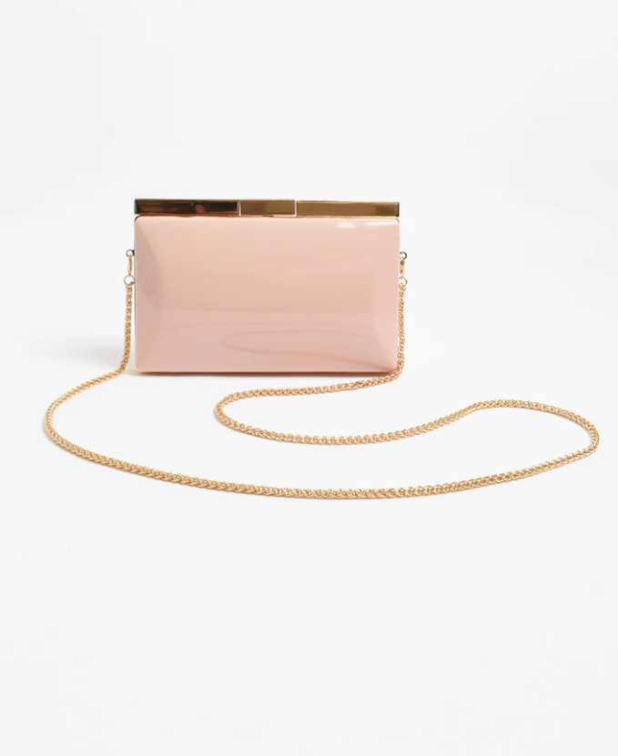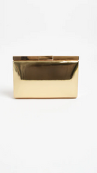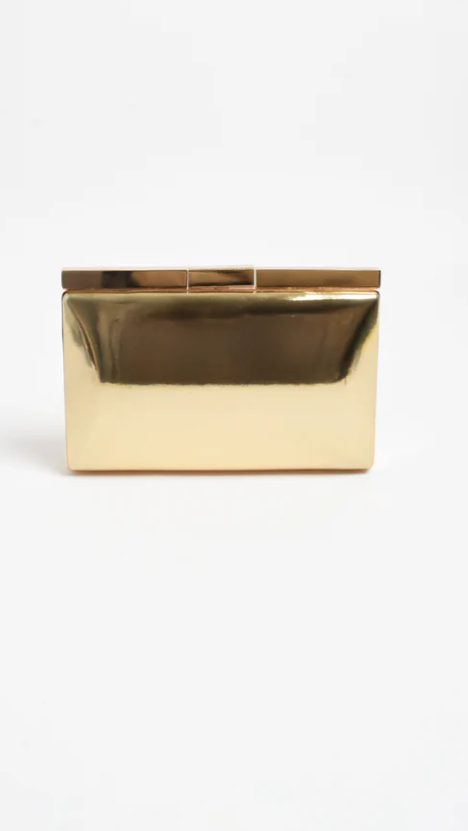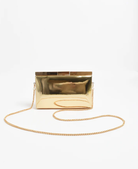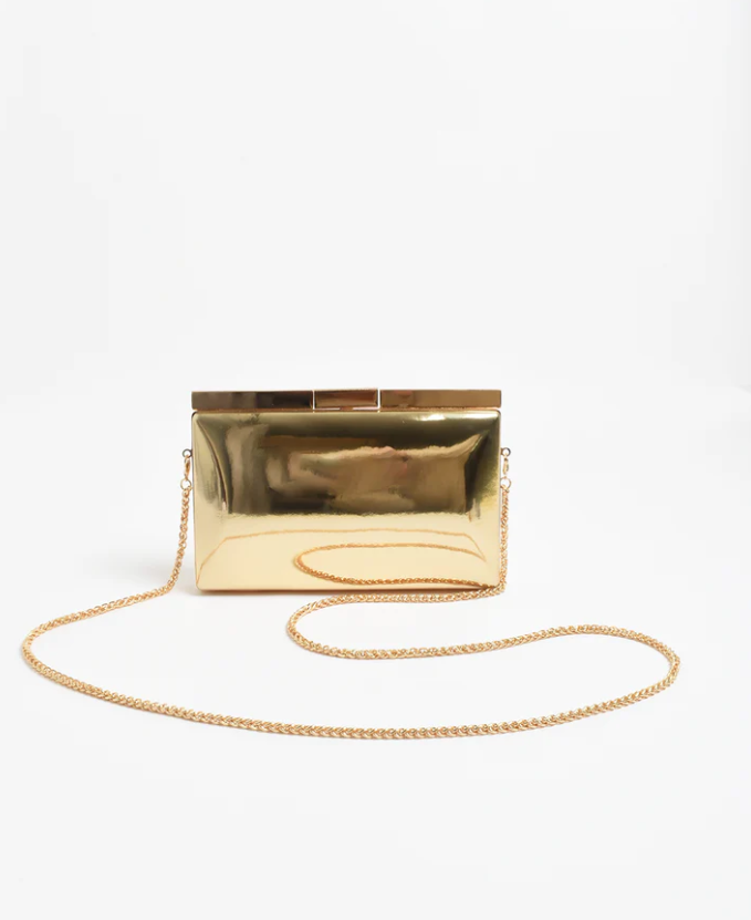 The Simona Gloss Structured Clutch features a gold frame and clasp with a padded, gloss-finished body. It includes an optional chain strap and is designed to accommodate most smartphones. Crafted from vegan leather and plated metal.