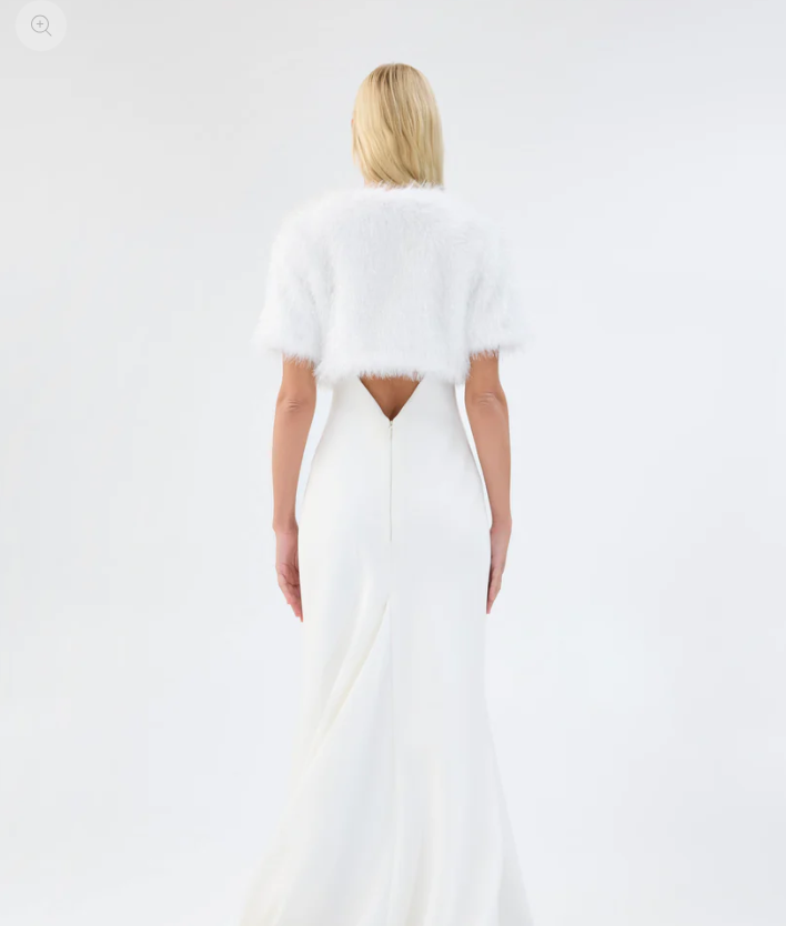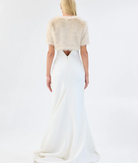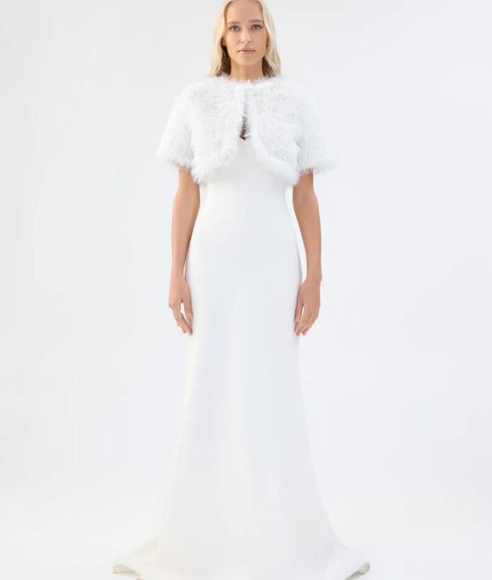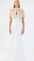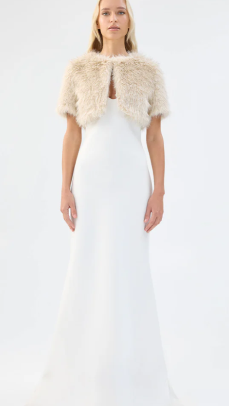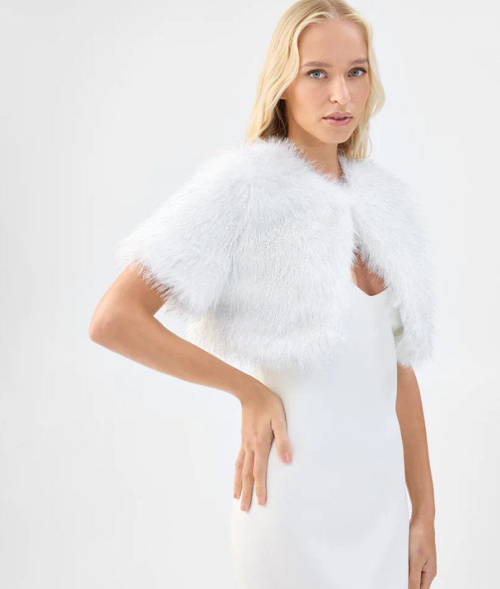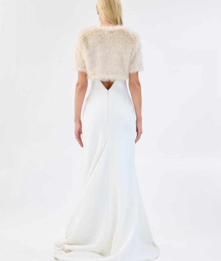 The Wings Bolero delivers quiet sophistication. Medium-pile faux fur with metallic highlights is selected for its texture and shine. The cropped design and round neckline add contemporary refinement, while the vegan fabric-covered hook and eye closure ensures an effortless fit.