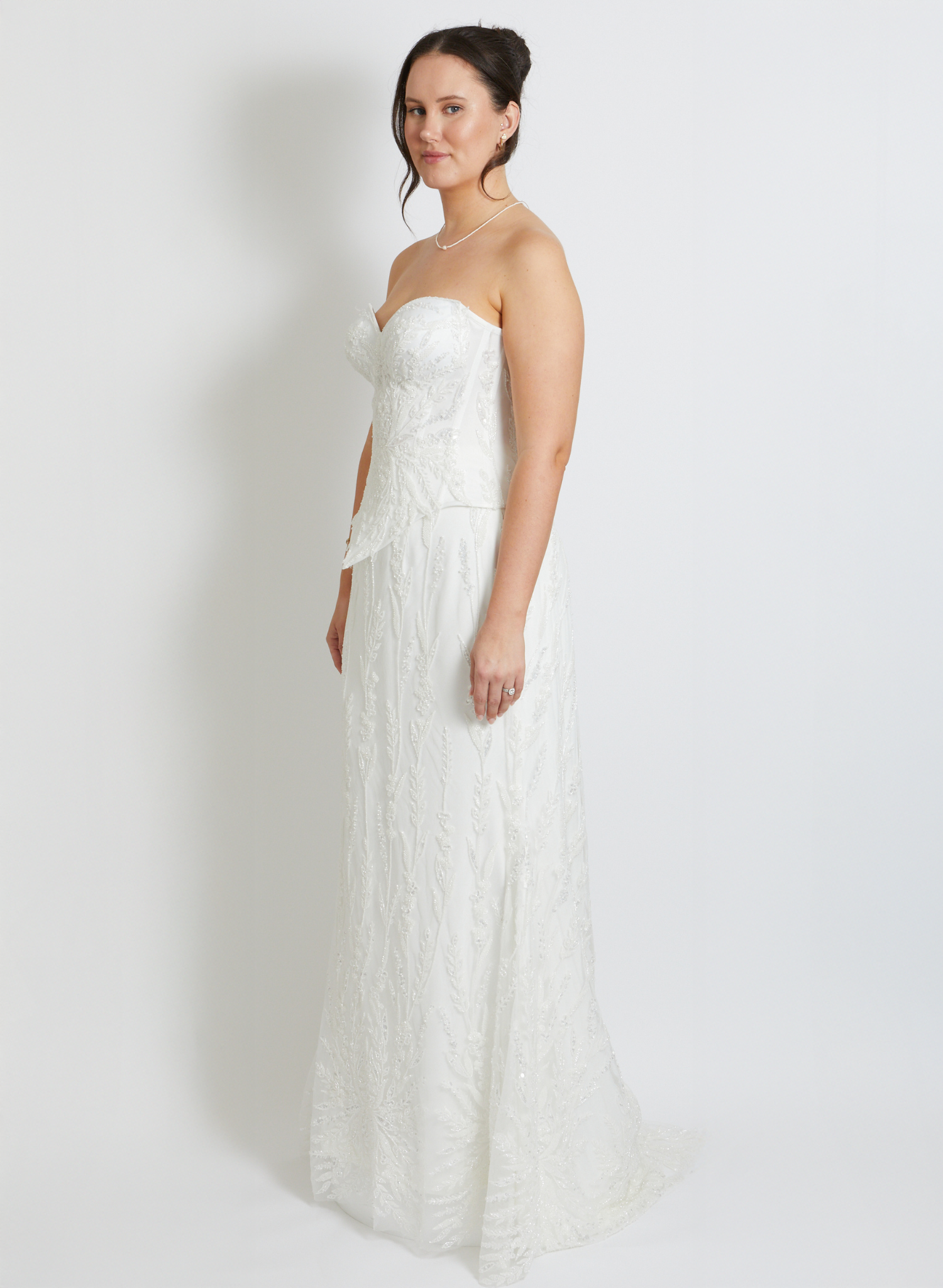 This structured strapless design features a romantic sweetheart neckline and a striking beaded lace overlay that catches the light beautifully. The pointed waistline creates a flattering, elongated silhouette, while internal boning provides exceptional support and a sculpted fit. Defined cups ensure comfort and confidence throughout your special day. The secure lace-up back allows for a customised fit, making this bodice an absolutely stunning choice for the bride seeking sophisticated sparkle and refined elegance.