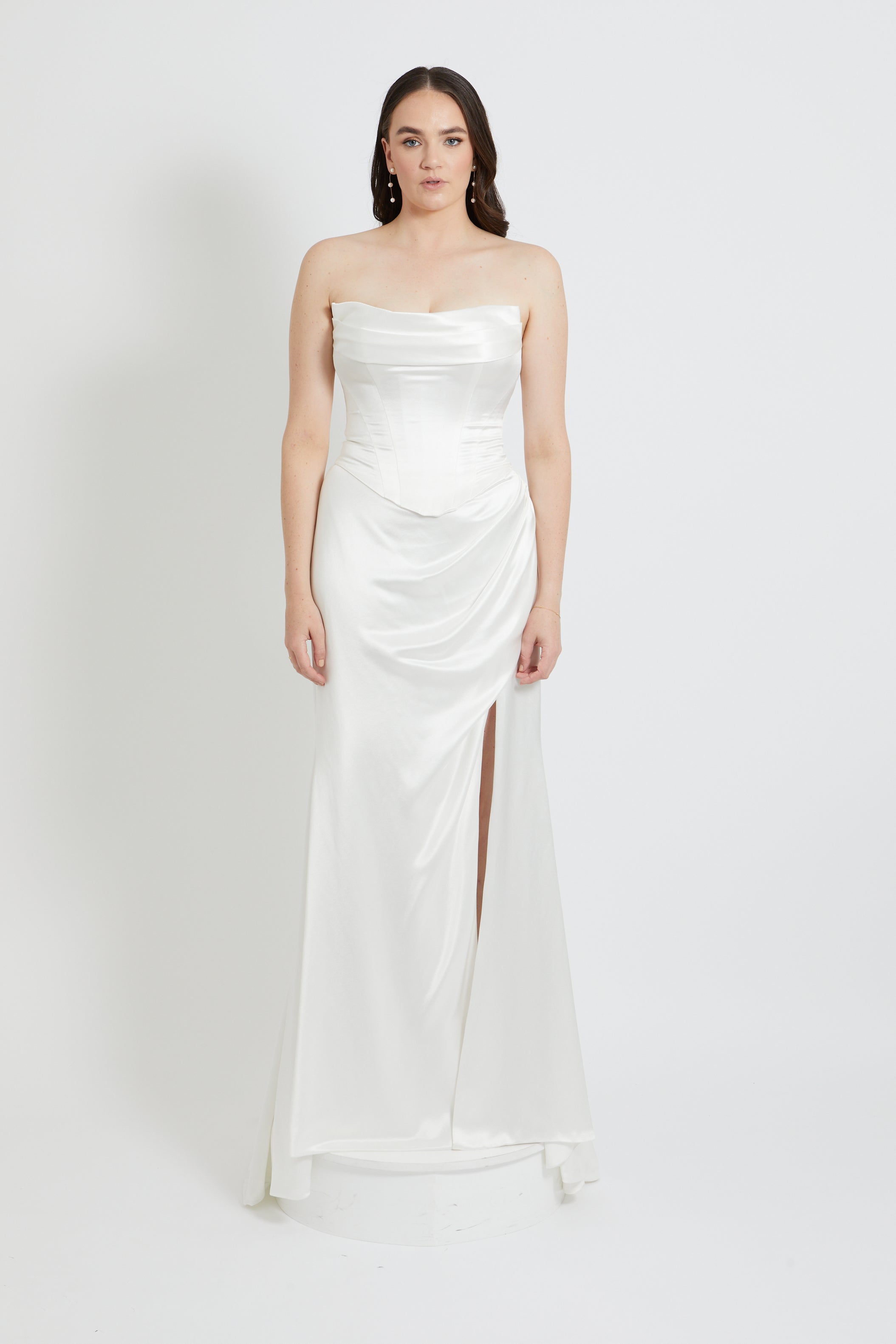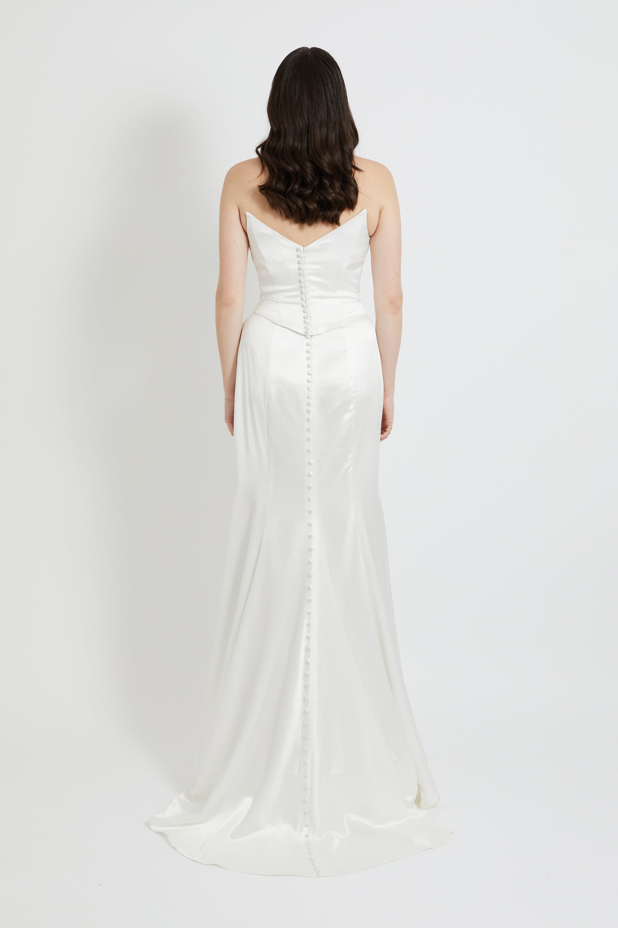 The Ava set showcases refined tailoring with a strapless silhouette and precisely engineered bodice featuring strategic front draping. The skirt presents a high leg split with fluid drape and continuous button closure extending to the hem, delivering a sophisticated balance of structure and movement. A masterfully constructed piece for the discerning wearer.