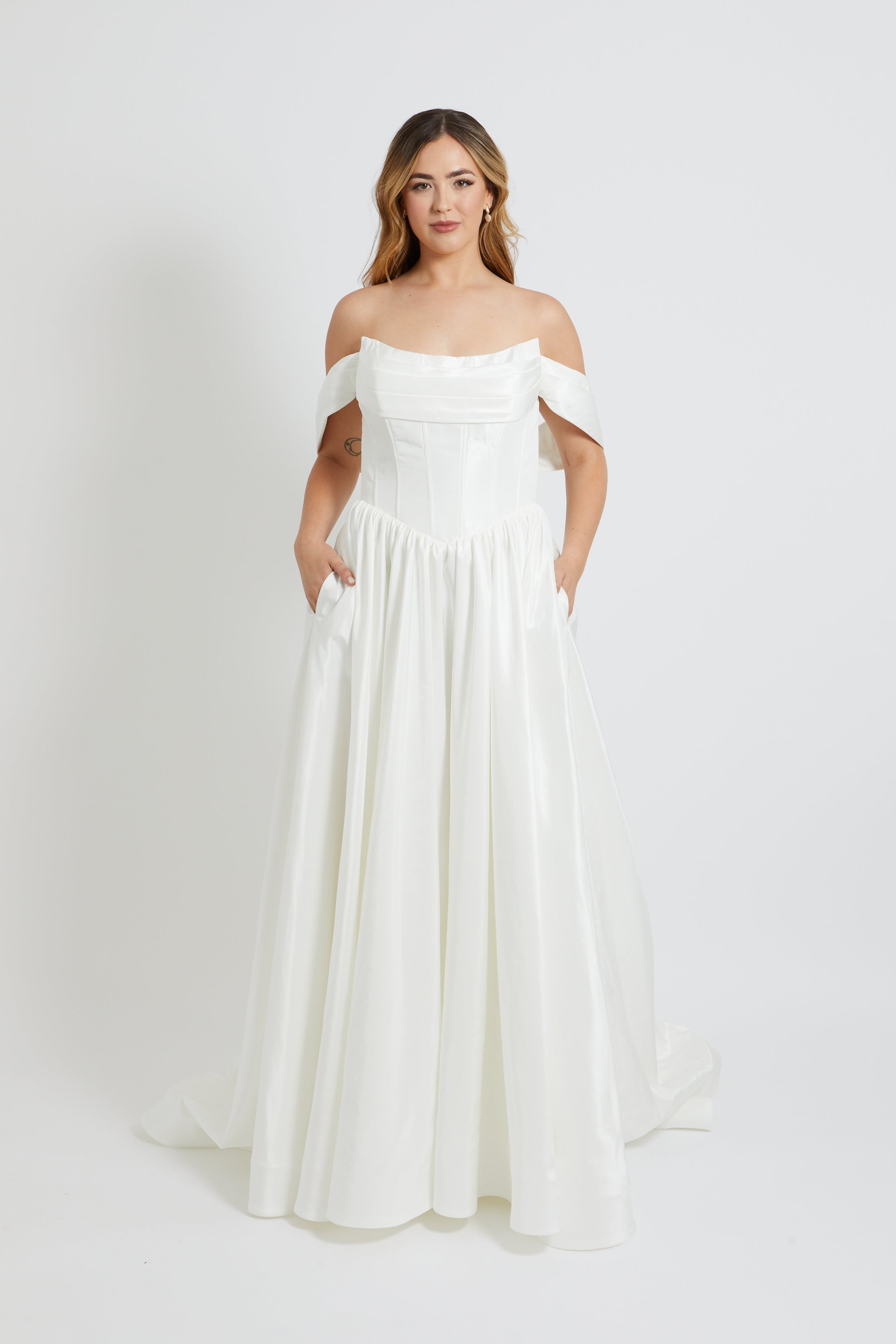 This sophisticated bridal gown combines architectural tailoring with romantic proportions. The structured bodice features a subtly dropped V-waist and scooped neckline, while detachable shelf accents offer versatile styling options. A generously gathered skirt creates graceful movement, secured by an expertly finished lace-up back with reinforced eyelets for lasting durability and support.
