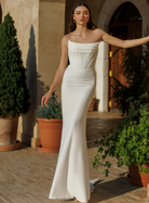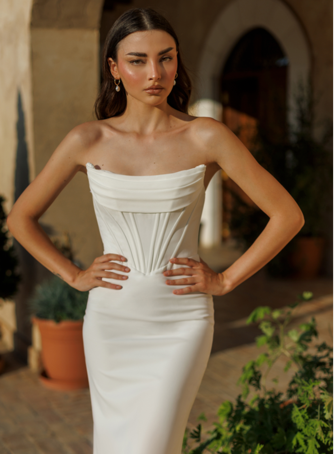 The back reveals a captivating arrangement of delicate straps and a line of covered buttons, adding a touch of classic charm. Flowing seamlessly from the waist, the skirt falls in a sleek, column-like fashion, highlighting the contours of the body and ending in a subtle train.