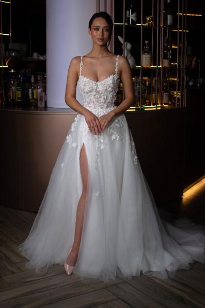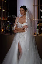 Discover the stunning daisy gown, designed to fill any bride with extra beauty. The structured corset features supportive boning and sculpted cups that create a flattering silhouette, while delicate floral embellishments cascade from the bodice onto the skirt. A voluminous tulle skirt with a daring leg split completes this show-stopping piece, perfect for making an unforgettable entrance at any special occasion.