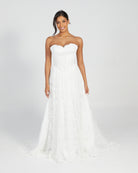 A full-length gown crafted in French lace, featuring a structured strapless bodice with defined cups and tulle across the front for a delicate overlay. The bodice includes a lace-up back for an adjustable fit. The skirt falls into soft gathers, creating volume and gentle movement.
