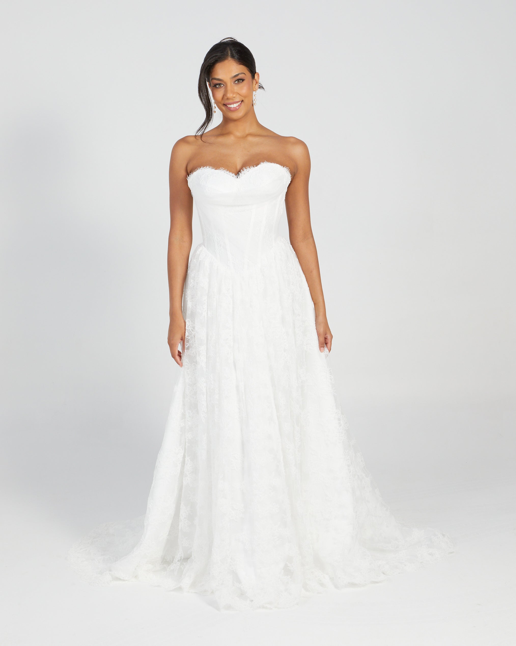 A Pearls & Roses Original design, featuring French lace, a strapless structured bodice with defined cups and tulle overlay across the front, lace-up back closure and gathered full-length skirt.