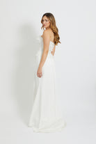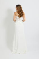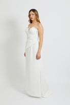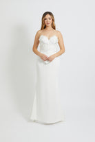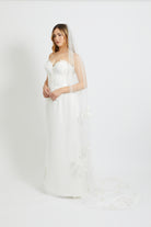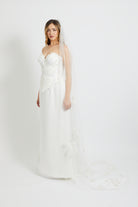 This strapless bodice showcases a romantic sweetheart neckline and delicate flutter flower embellishments that dance across the piece, creating visual poetry. The pointed waistline flatters your silhouette beautifully, while internal boning delivers exceptional support and a sculpted fit. Defined cups ensure confidence and comfort throughout your special day. The secure lace-up back provides a customised finish, making this bodice an enchanting choice for the bride seeking both elegance and distinctive detail.
