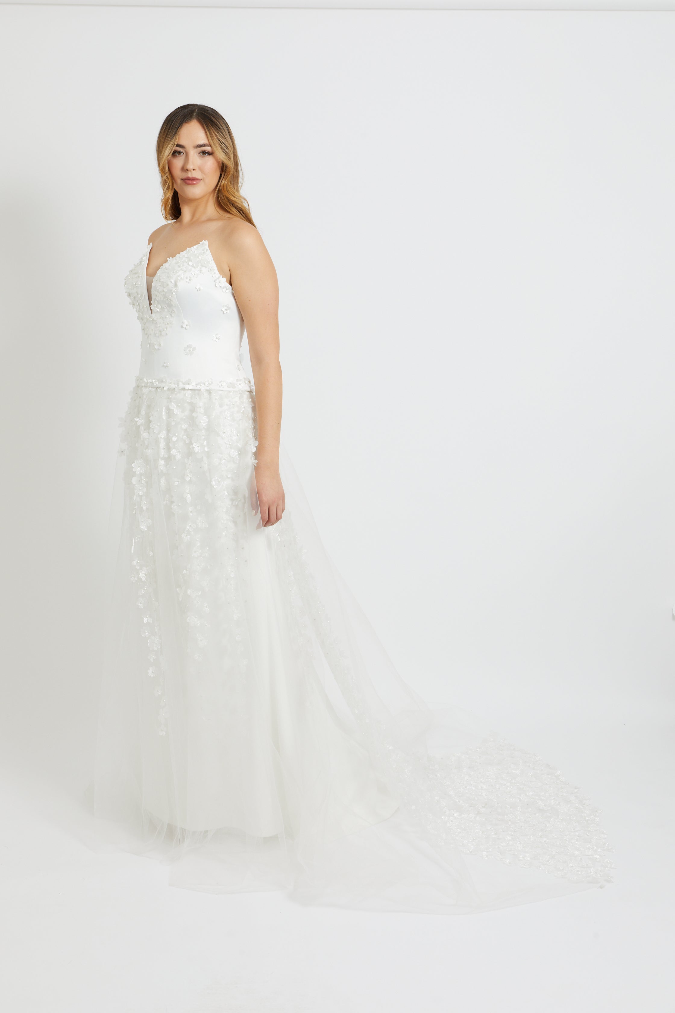 Make a striking statement with the Flutter Bodice, a daring Pearls and Roses design that exudes confidence and allure. This strapless bodice showcases a dramatic deep V neckline with distinctively pointed cups that create an unforgettable silhouette. Adorned with pearl and floral embellishments, it combines artistic detail with architectural precision. Internal boning provides exceptional support and structure, while the secure lace-up back ensures a custom fit. The straight-cut waistline grounds this bold piece in elegance, perfect for the modern bride seeking something truly extraordinary.