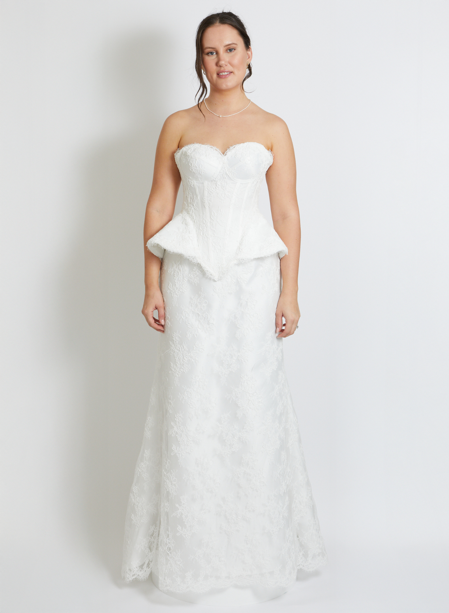 This strapless bodice showcases intricate French lace detailing paired with strategic boning that sculpts and supports your silhouette beautifully. The sweetheart neckline and pointed waistline work together to create a flattering, romantic aesthetic that photographs flawlessly. The lace-up back closure offers both security and a touch of vintage charm, while the structured cups ensure confidence on your special day. Perfect for brides seeking timeless sophistication with modern construction.