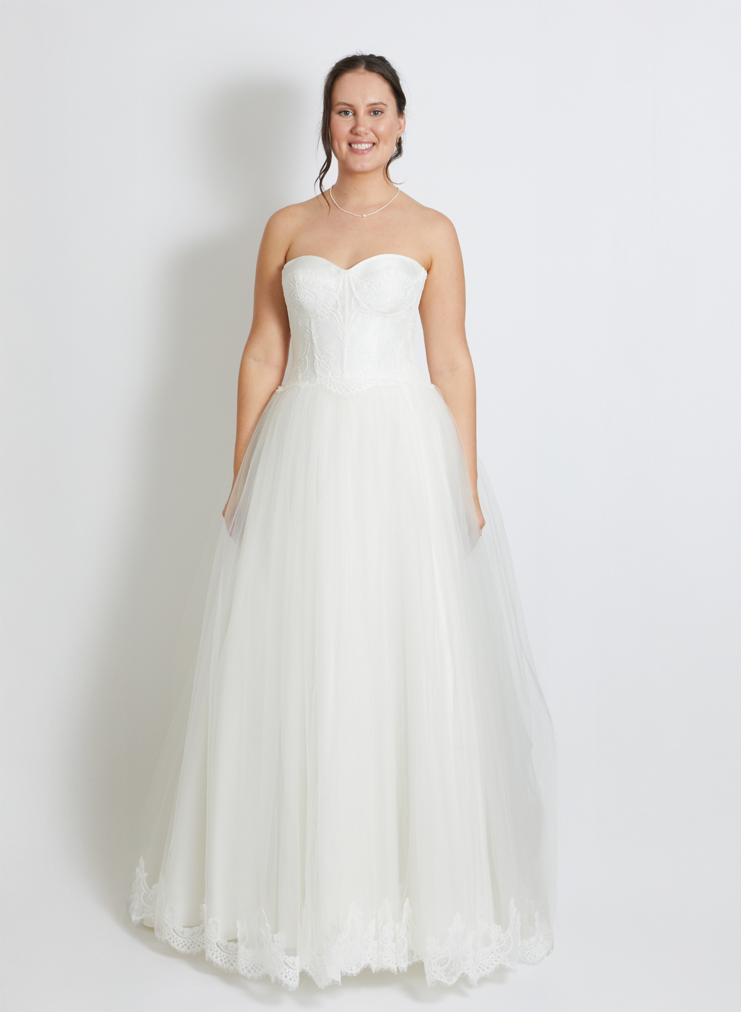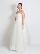 A classic tulle ballgown skirt paired with a structured bodice for a regal bridal silhouette. The bodice features defined cups, boning for support, and a French lace overlay for delicate detail.