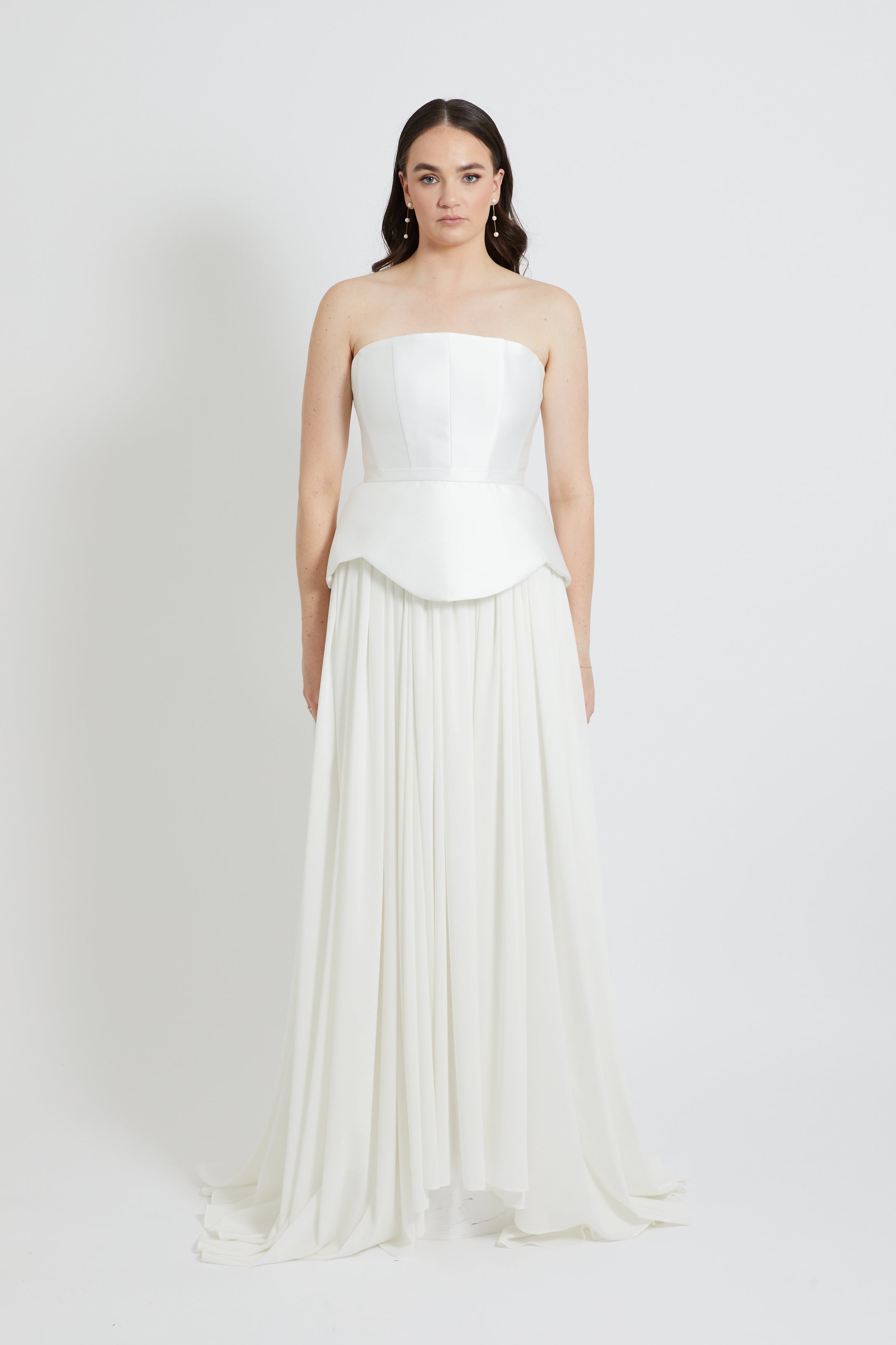 Introducing the Genevieve—a bold strapless statement piece that commands attention. This Pearls and Roses original features luxurious mikado fabric with architectural precision: a striking straight neckline, sculpted curved waistline, and a matching belt that cinches with confidence. The skirt flows with subtle curved hem detailing for movement and grace. Internal boning delivers unwavering support and a powerfully structured silhouette, while discreet hook-and-eye closures ensure a seamless finish. Daring, refined, unforgettable.
