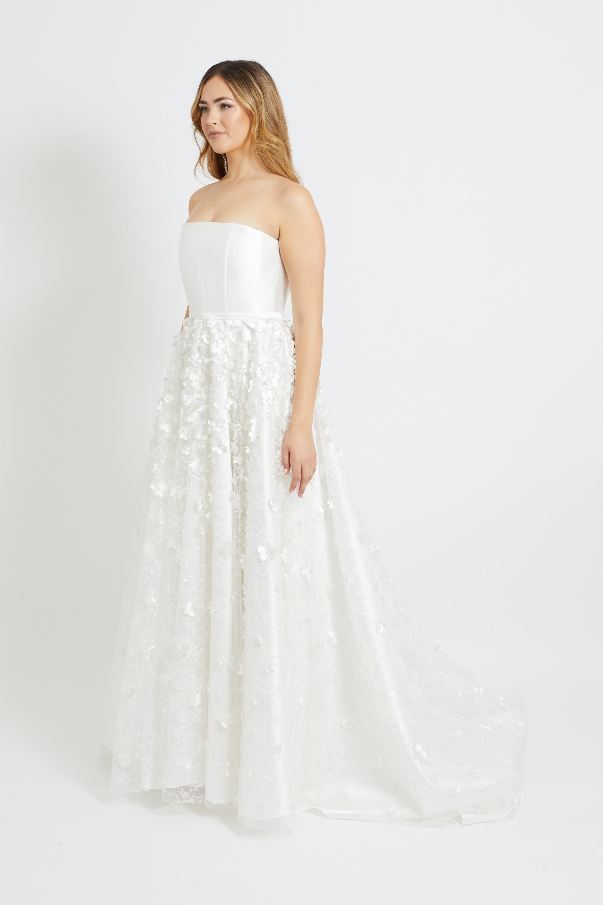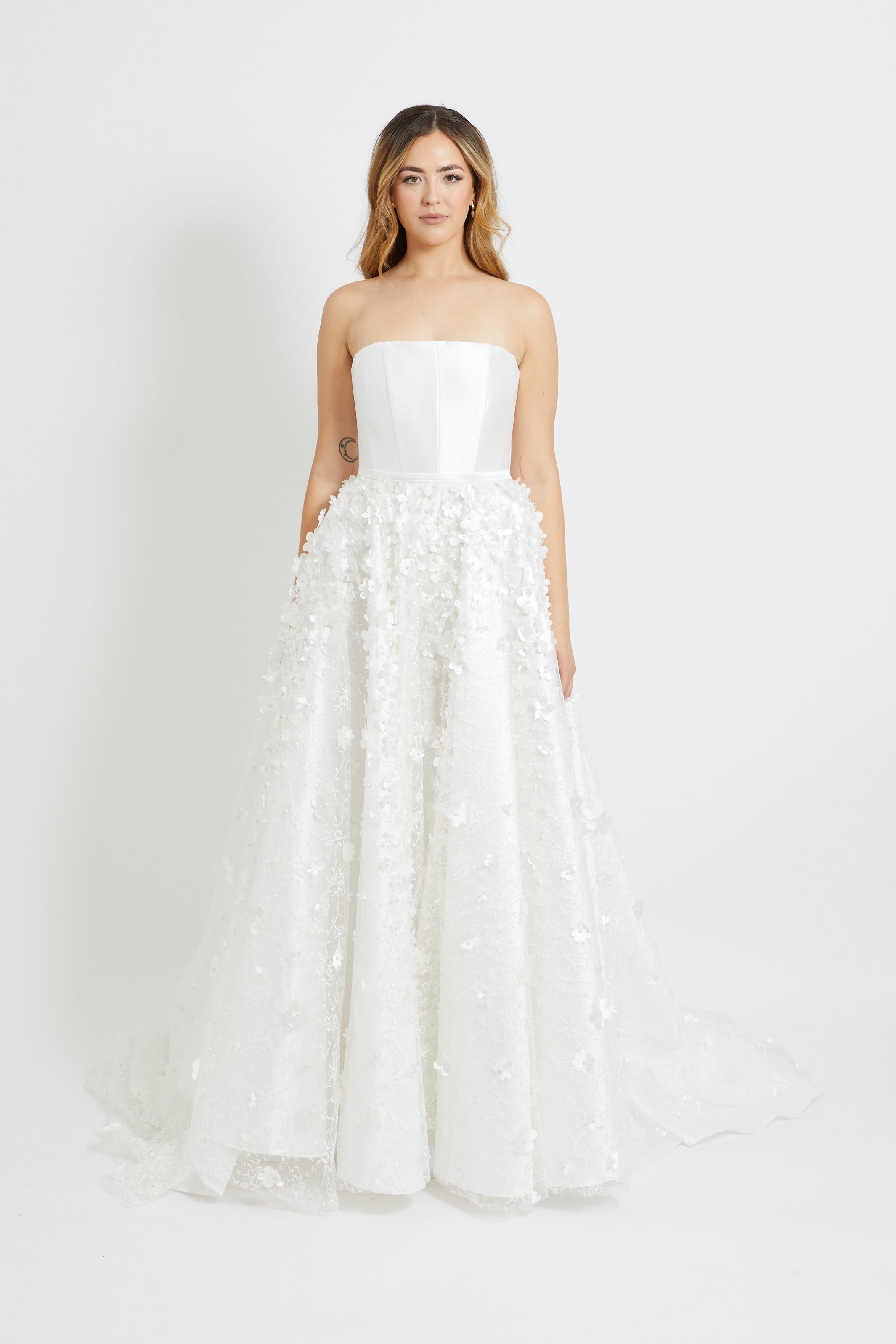 Meet Grahnia - Crafted exclusively by Pearls & Roses, this design pairs a sculpted mikado bodice with a striking waistband that cinches and celebrates your silhouette. The breathtaking flutter tulle skirt sweeps with theatrical presence, while the strapless neckline exudes raw confidence and edge. Finished with a concealed back zipper for a polished look. For anyone ready to command the room and own their power with absolute conviction.