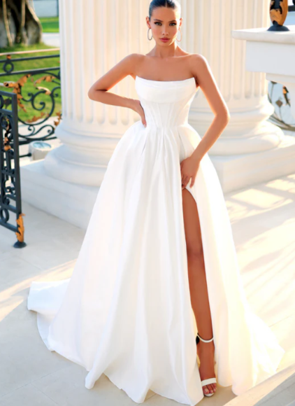 If elegance meets allure in this dress featuring a scooped strapless neckline, complemented by folded bust detailing. The flowy A-line ball gown silhouette adds a touch of grace, while the seamless thigh-high split introduces a hint of allure and movement. This dress is a perfect blend of sophistication and subtle daring, making it an ideal choice for those who appreciate timeless style with a modern twist.
