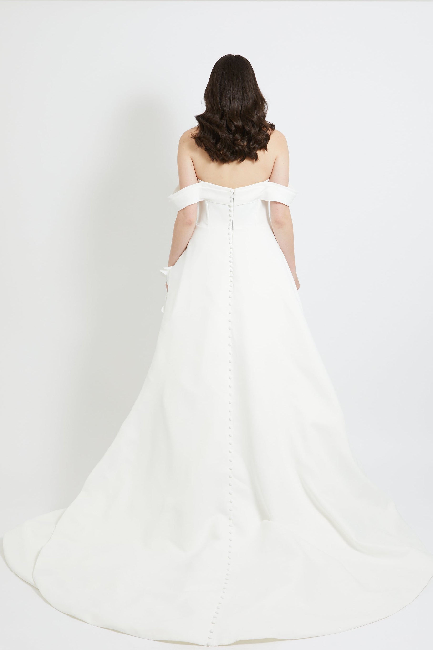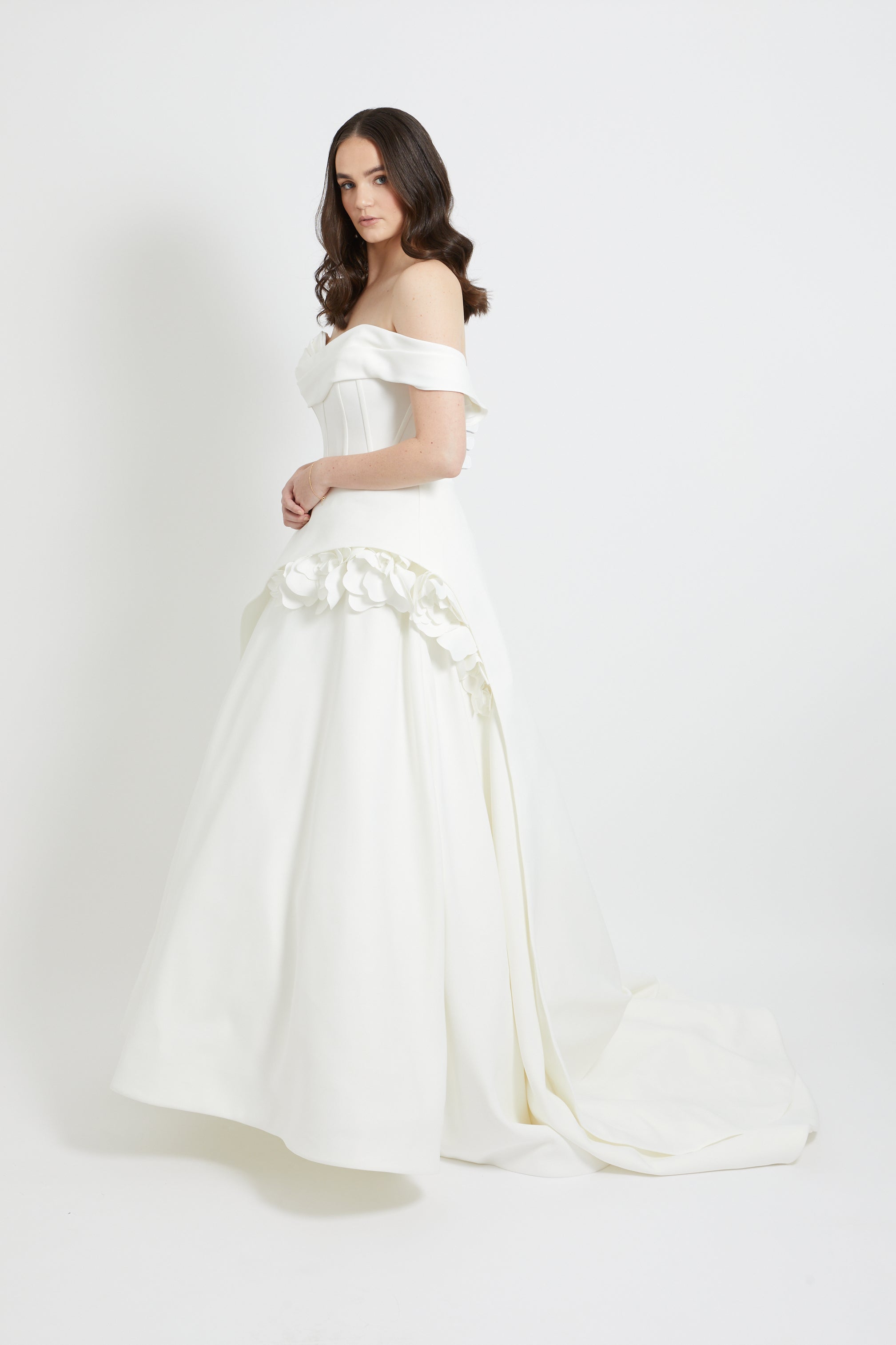 The Petal Gown showcases refined elegance through its expansive skirt and sculptural floral peplum. Off-shoulder straps with crossover front detailing and graceful draped elements create a sophisticated neckline that balances the gown's generous proportions. This design combines architectural precision with romantic femininity, ideal for those seeking understated luxury at formal events.