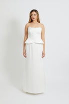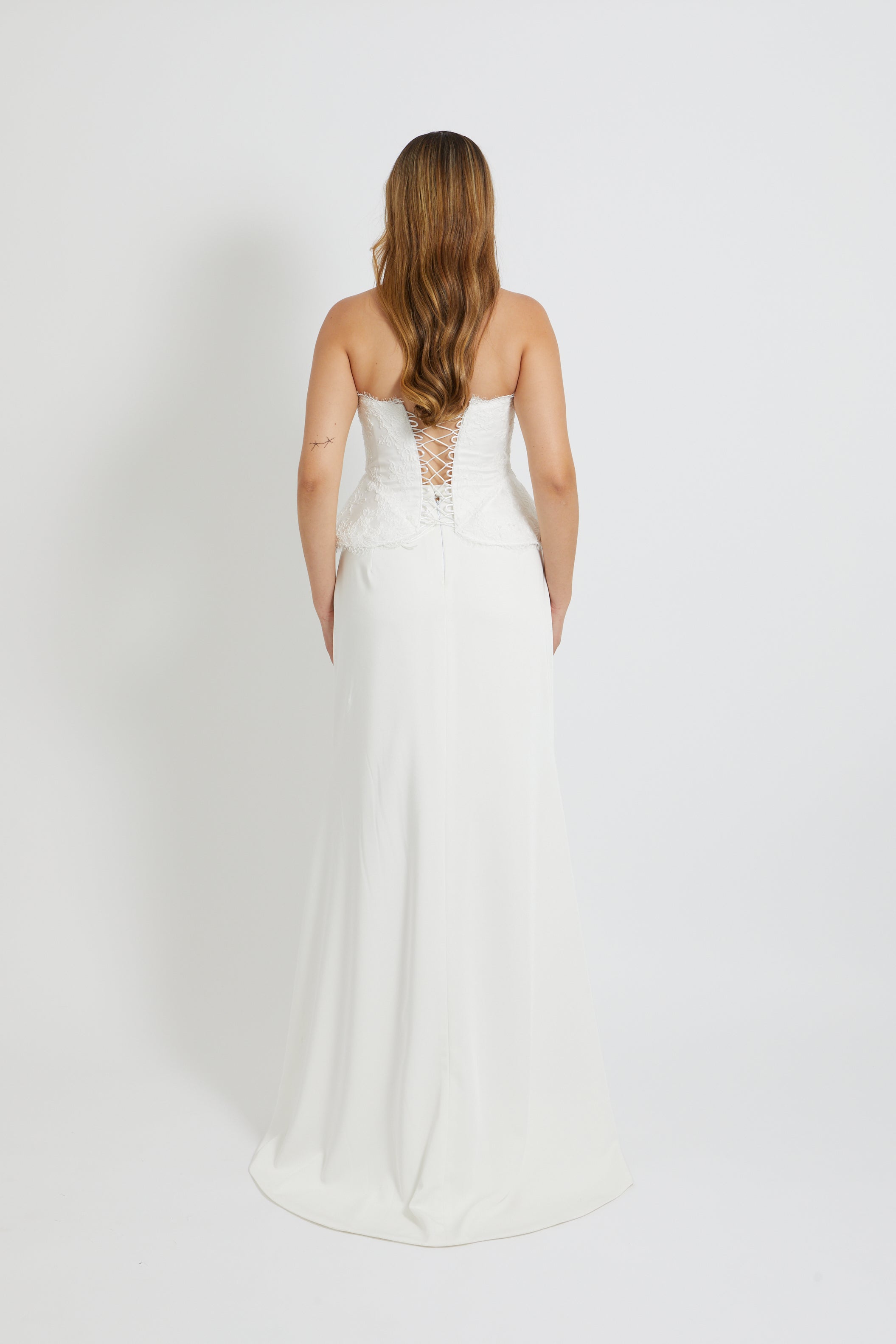 This strapless piece features a graceful scooped neckline and distinctive winged details that create dimension and visual interest. Crafted from delicate French lace, it offers sophisticated texture throughout, while internal boning and defined cups ensure a beautifully sculpted fit. The secure lace-up back provides customisable support and a polished closure. With its straight-cut waistline and refined construction, the Poppy is the perfect foundation for an unforgettable bridal ensemble.