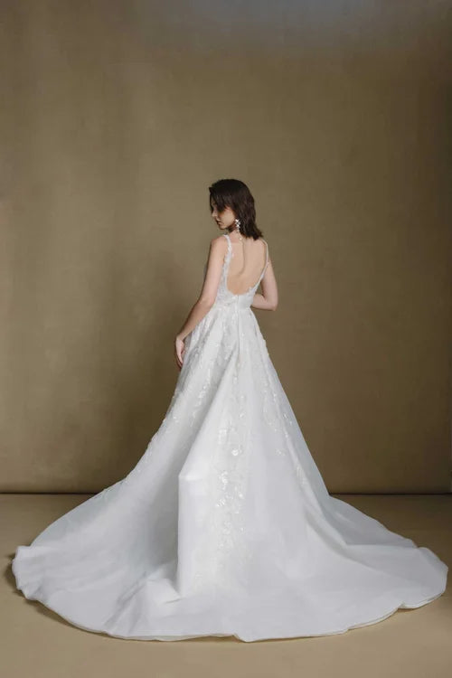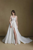 Princess Lily is the gown you've been envisioning—a fully beaded masterpiece that transforms you into the radiant bride you deserve to be. Every bead is meticulously placed to create an enchanting shimmer that photographs beautifully and captivates in person. The structured bodice with visible boning doesn't just look stunning; it provides the support and confidence you need to move gracefully throughout your celebration. Adjustable straps ensure comfort without compromising elegance, while the dramatic leg split offers a bold, fashion-forward moment that sets you apart. The low scooped back reveals just enough to create an unforgettable impression as you walk away. This isn't simply a dress—it's an investment in feeling absolutely extraordinary on your most important day. Princess Lily delivers the perfect blend of timeless romance and modern sophistication that makes every bride feel like royalty.
