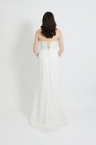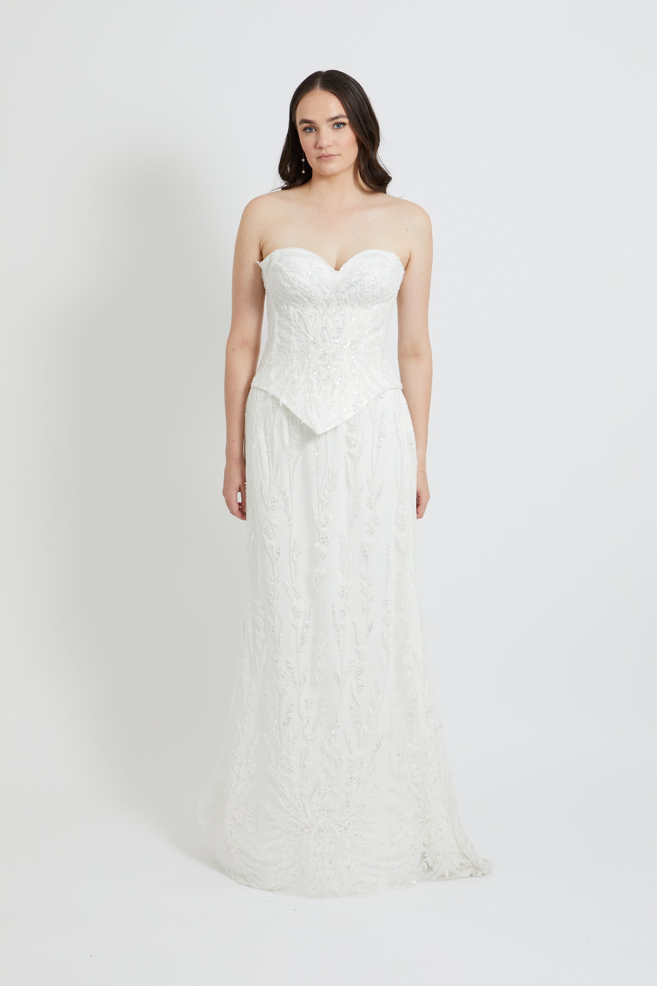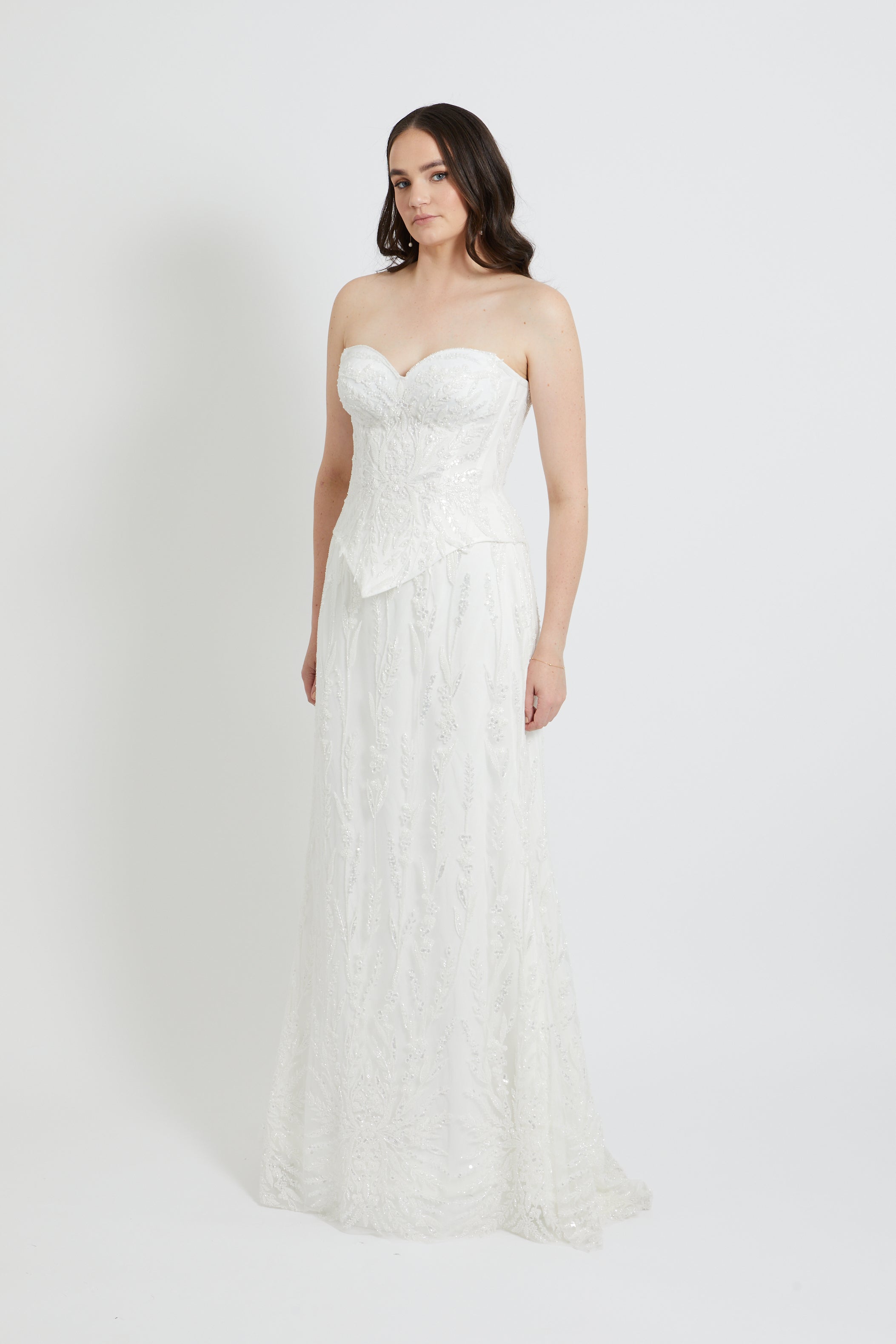 This structured strapless design features a romantic sweetheart neckline and a striking beaded lace overlay that catches the light beautifully. The pointed waistline creates a flattering, elongated silhouette, while internal boning provides exceptional support and a sculpted fit. Defined cups ensure comfort and confidence throughout your special day. The secure lace-up back allows for a customised fit, making this bodice an absolutely stunning choice for the bride seeking sophisticated sparkle and refined elegance.